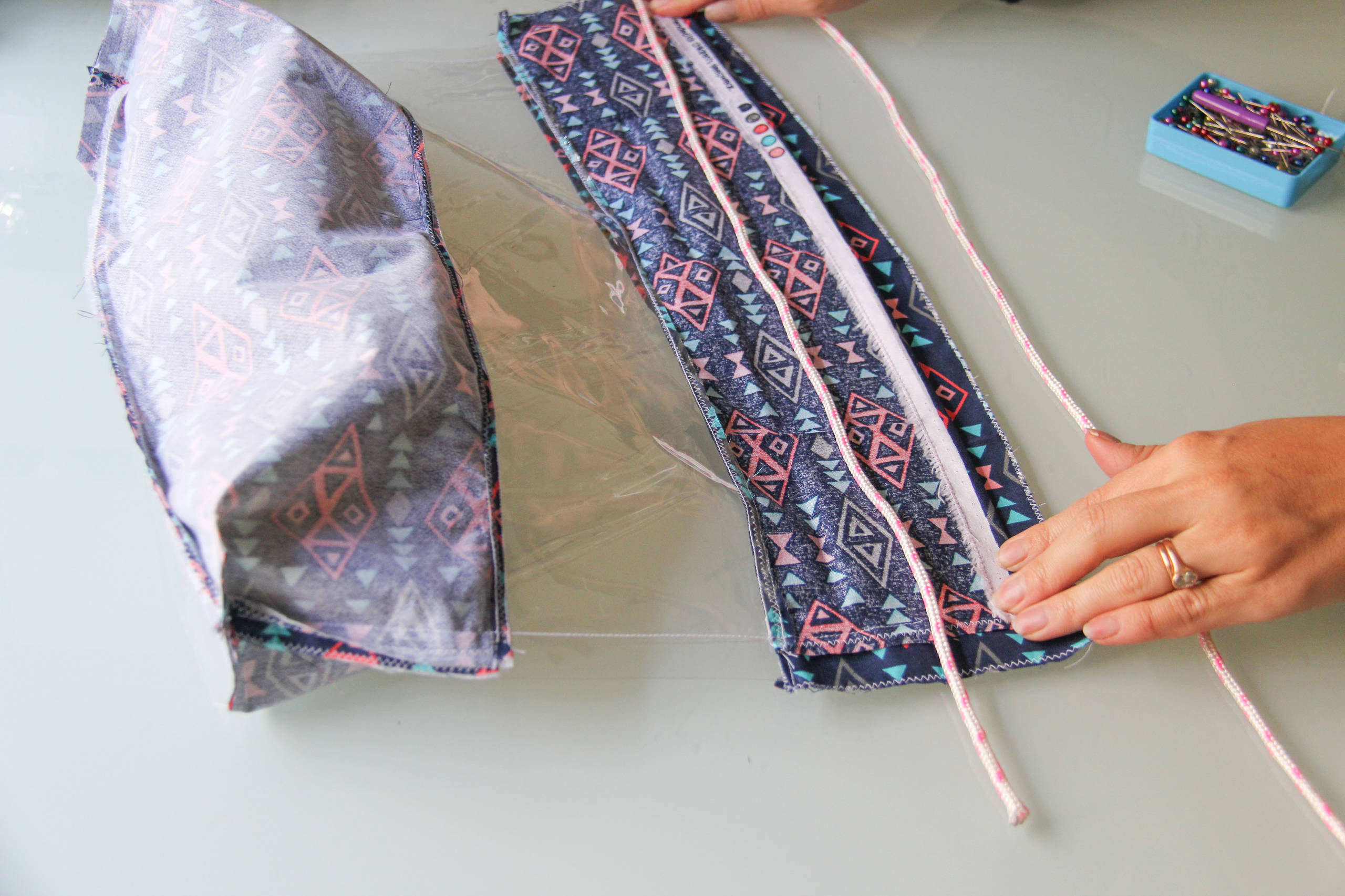 En gardant la couture de 6 mm en dessous, pliez-la à nouveau avec le ruban ou la cordelette et épinglez. Faites les coutures pour fermer l’ouvrage en faisant bien attention à ne pas coudre le ruban ou la cordelette.
