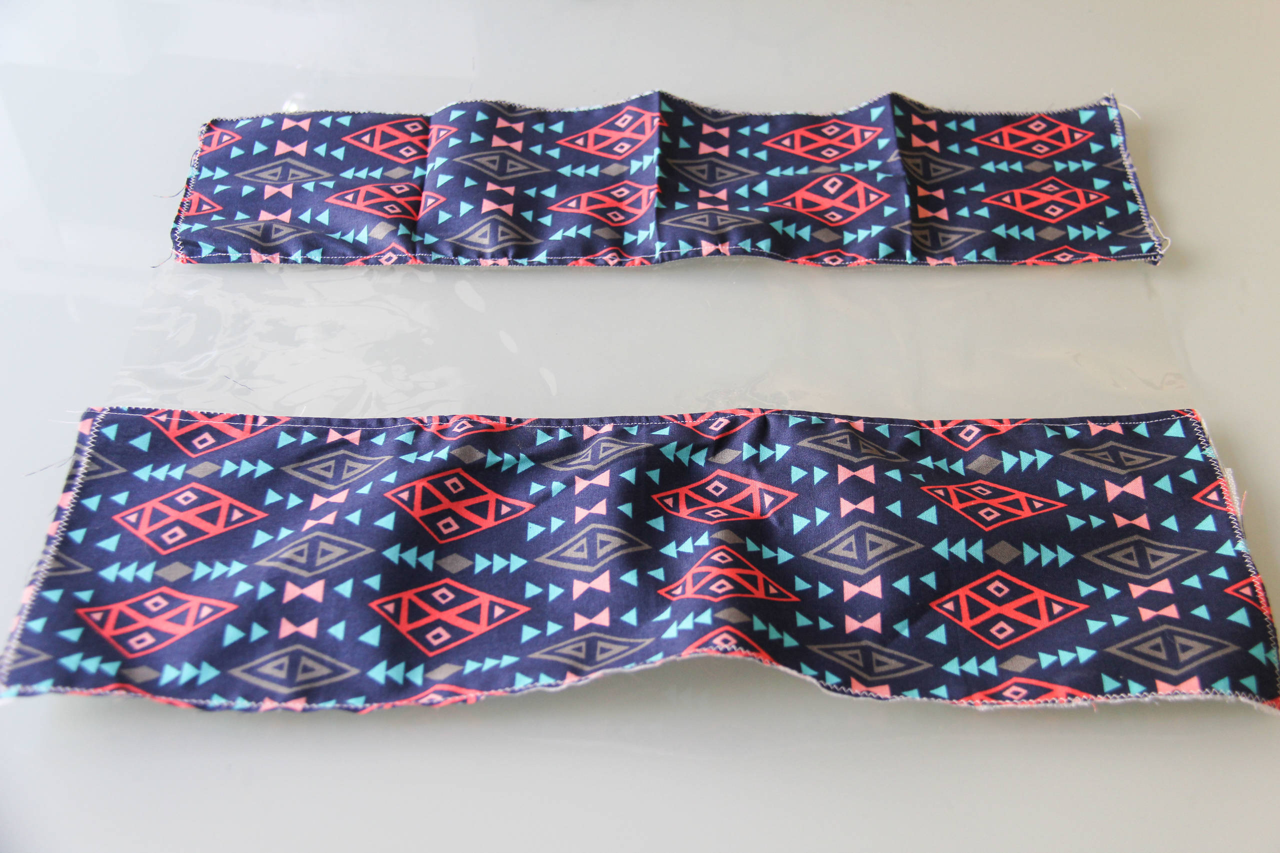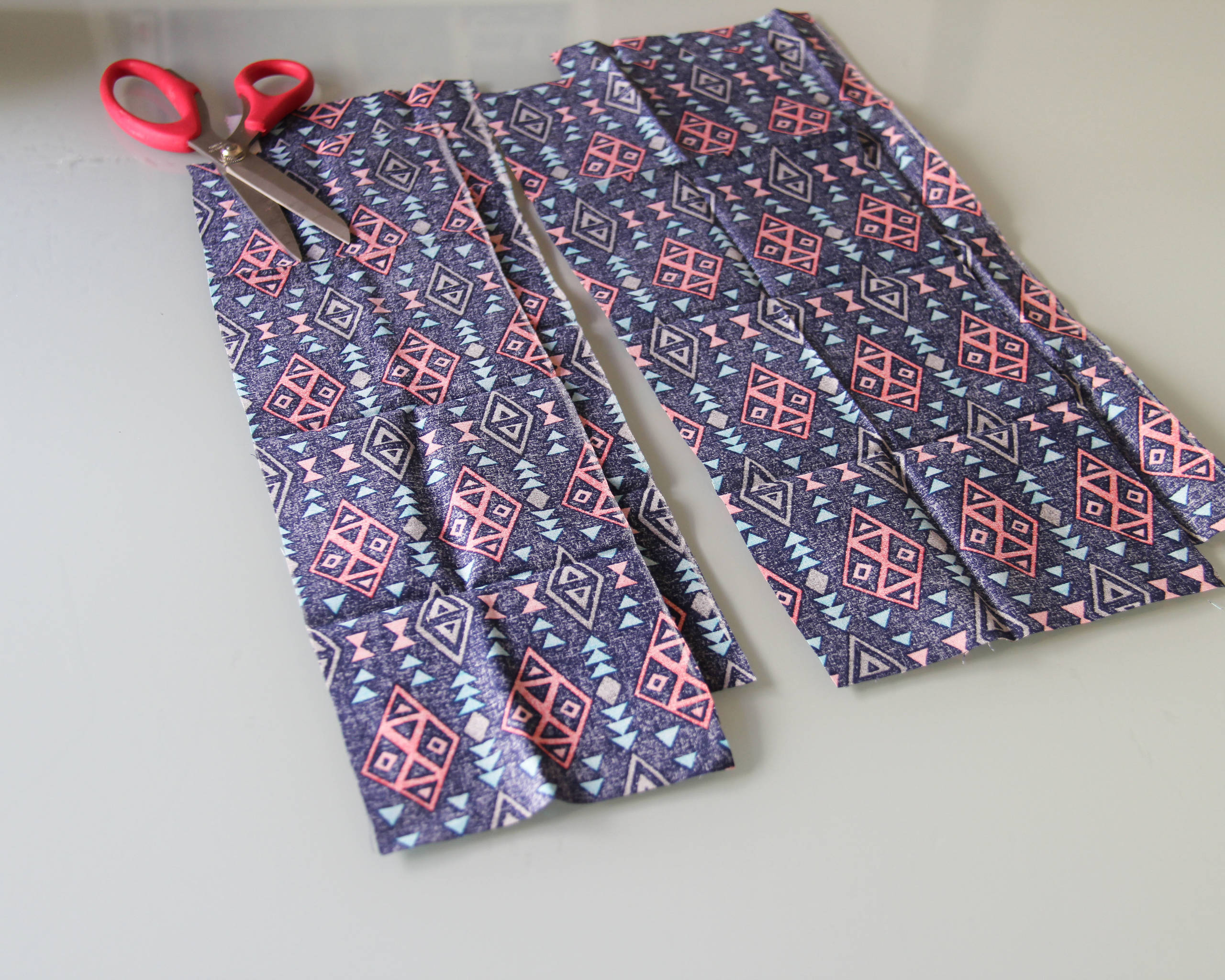 - Découpez deux morceaux de 12 cm x 45 cm de tissu : ceux-ci formeront la partie supérieure.