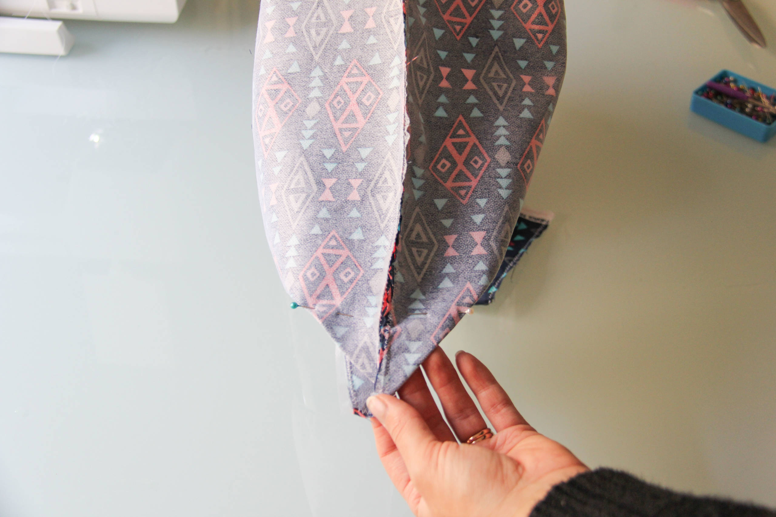 Mettez votre main à l’intérieur et faites un triangle dans le coin inférieur. Mesurez 7,5 cm de diamètre et épinglez le pli.