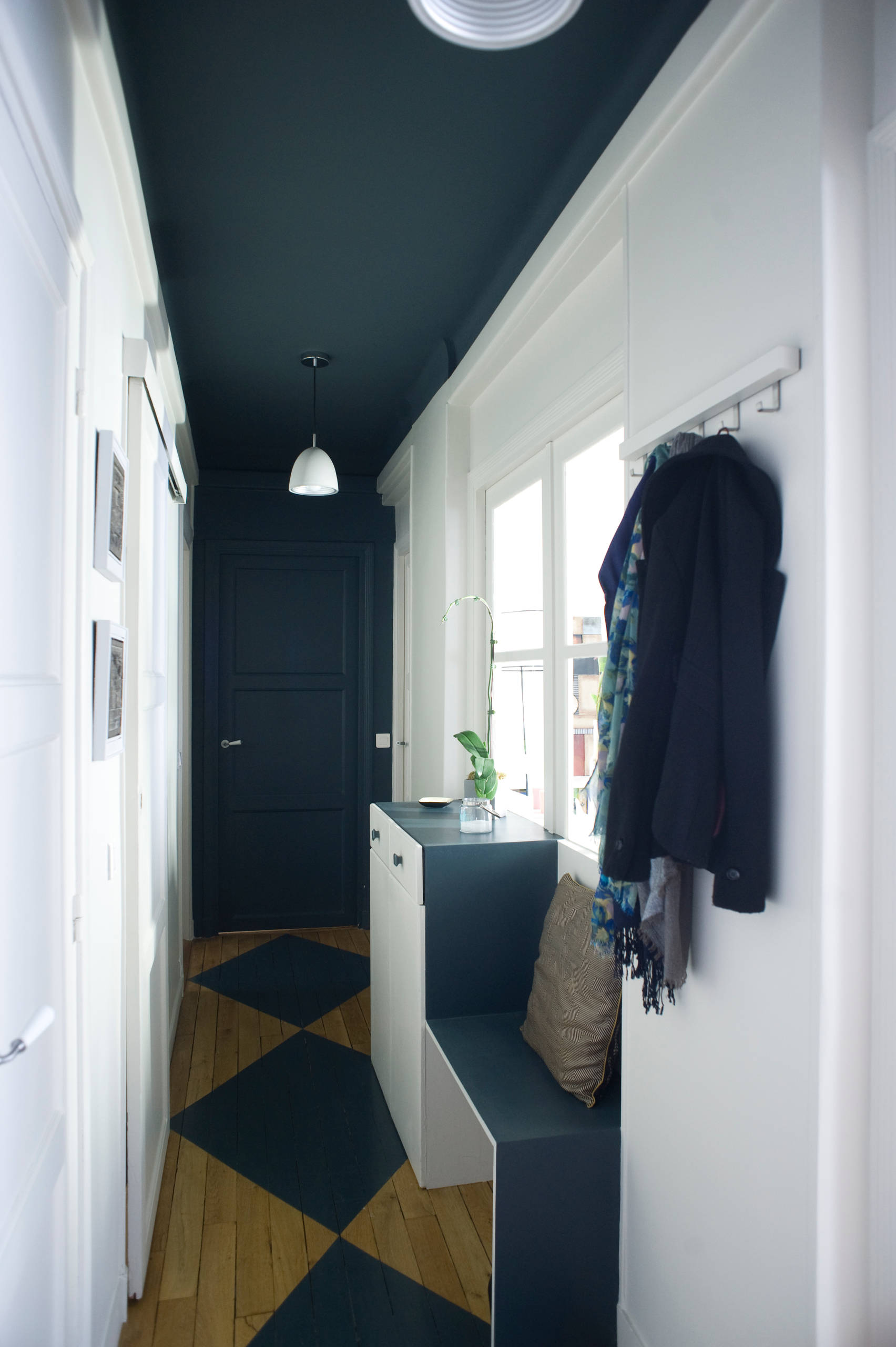 Il n’y a rien à faire, cette entrée est exiguë et manque de personnalité. Mais ça, c’était avant de repeindre son plafond en noir et de dessiner des losanges assortis au sol. Le noir abaisse visuellement le plafond et rend l’espace plus intime.
