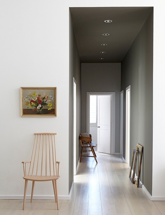 L’habileté de ce relooking réside dans la création d’un espace à part entière grâce à la couleur. La réalisation est ici particulièrement originale puisque trois teintes de gris plus ou moins foncées ont été associées (’Grey Moss’, ‘Cool Arbour’ et ‘Wood Ash’ chez Little Greene.)