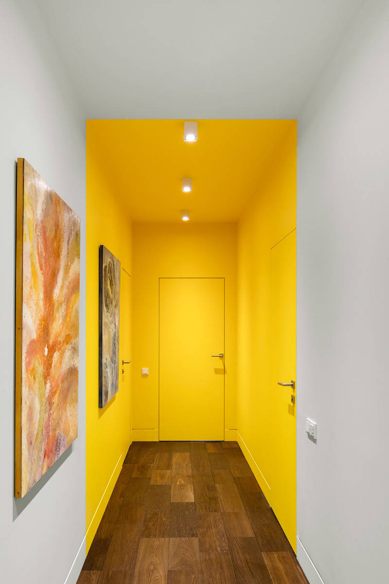 Et dans les espace sombres, dénués de toute ouverture sur l’extérieur, il peut être judicieux d’opter pour une couleur lumineuse comme ce jaune flamboyant ! Cela donne une impression de clarté au couloir.