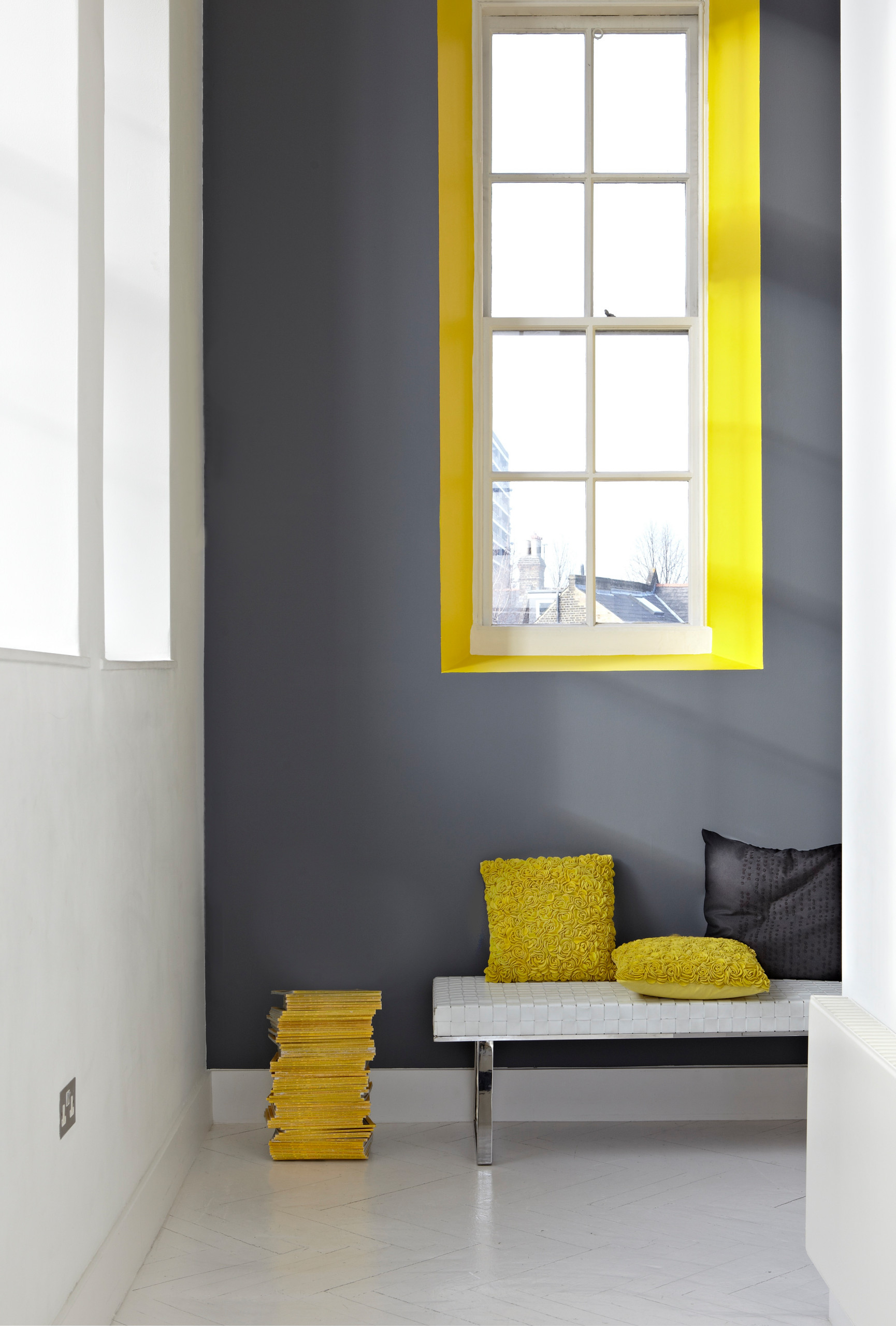 Le fluo utilisé par petites touches est très tendance. Dans un couloir qui manque de peps, n’hésitez pas à en faire usage pour ensoleiller un cadre de fenêtre. Il sera d’autant plus percutant que le fond sera classique voire austère, à l’instar de cet anthracite.