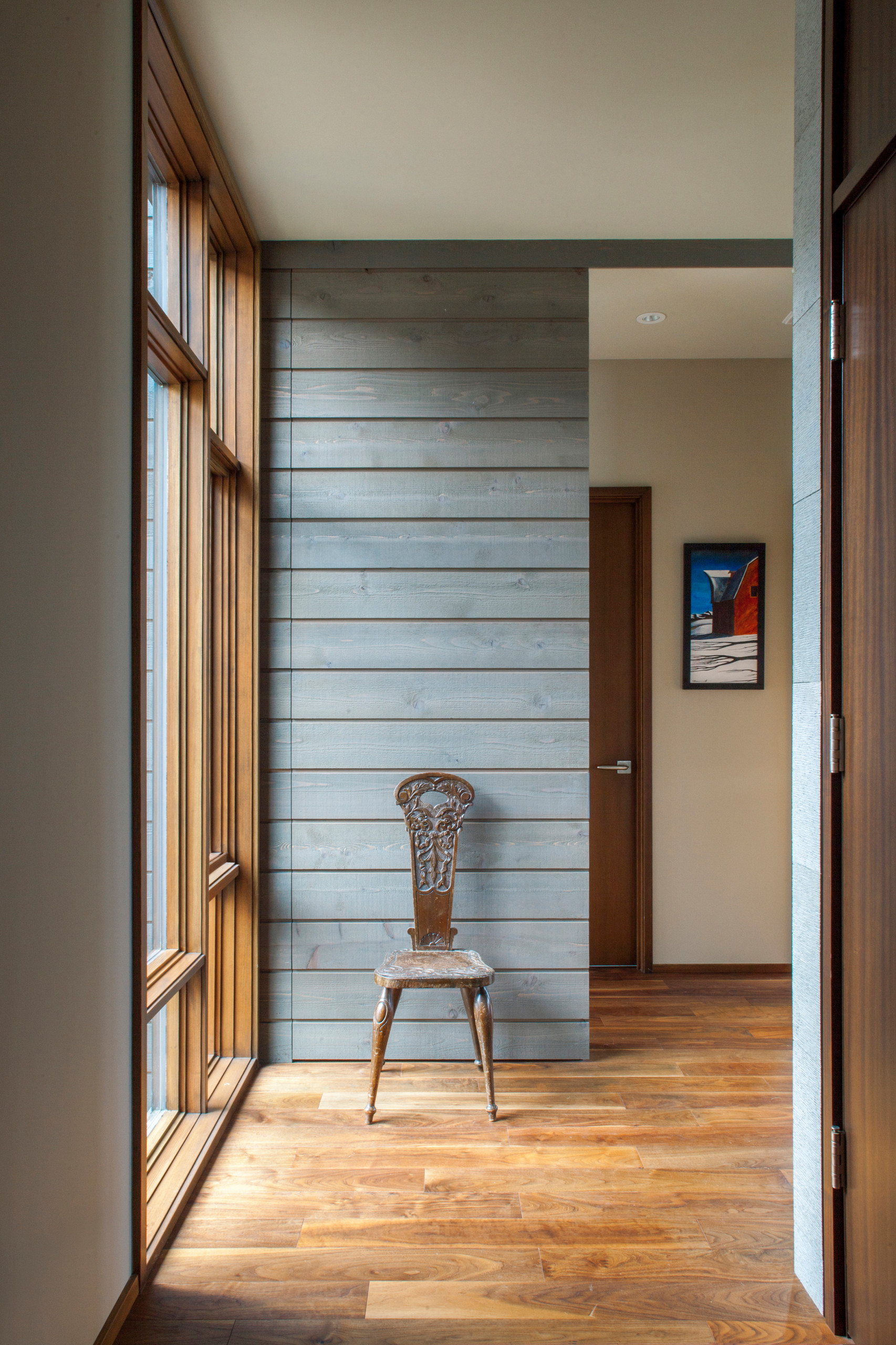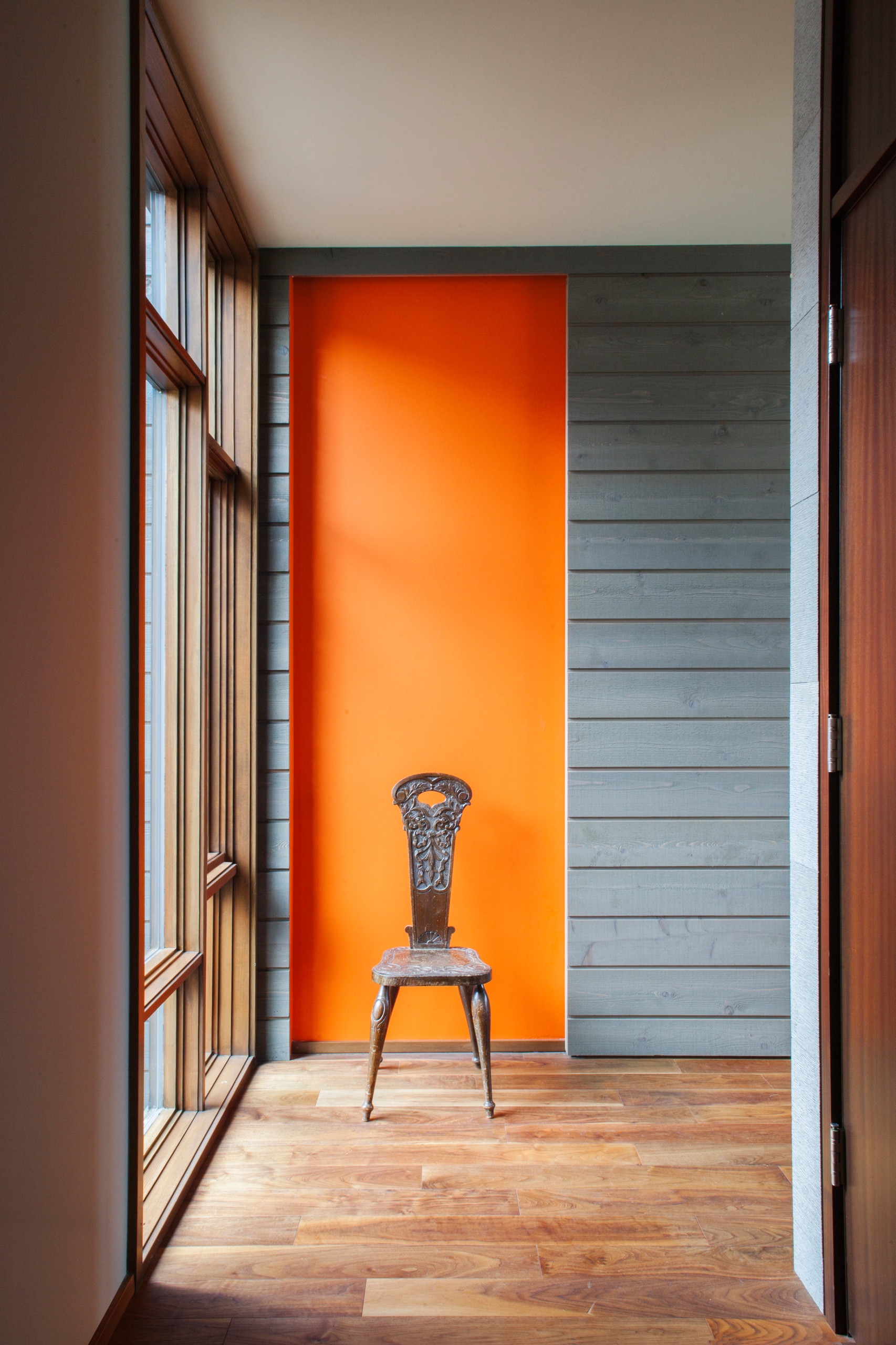 Le lambris est une porte coulissante derrière laquelle le pan de mur a été peint en orange solaire. Lorsque l’on ferme la porte et que cette couleur vitaminée apparaît, l’ambiance du couloir est transfigurée.