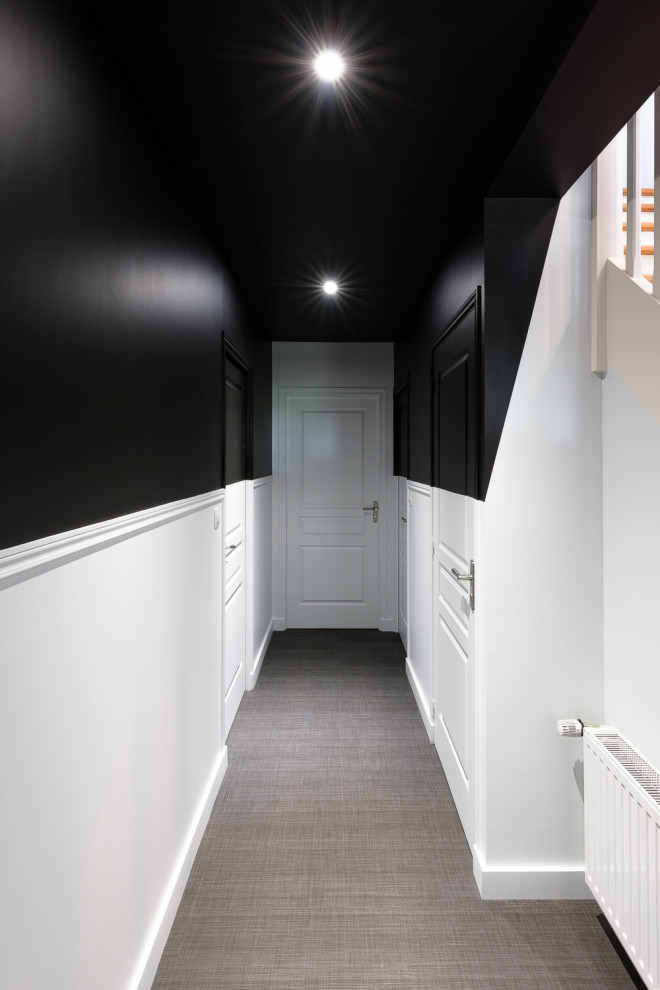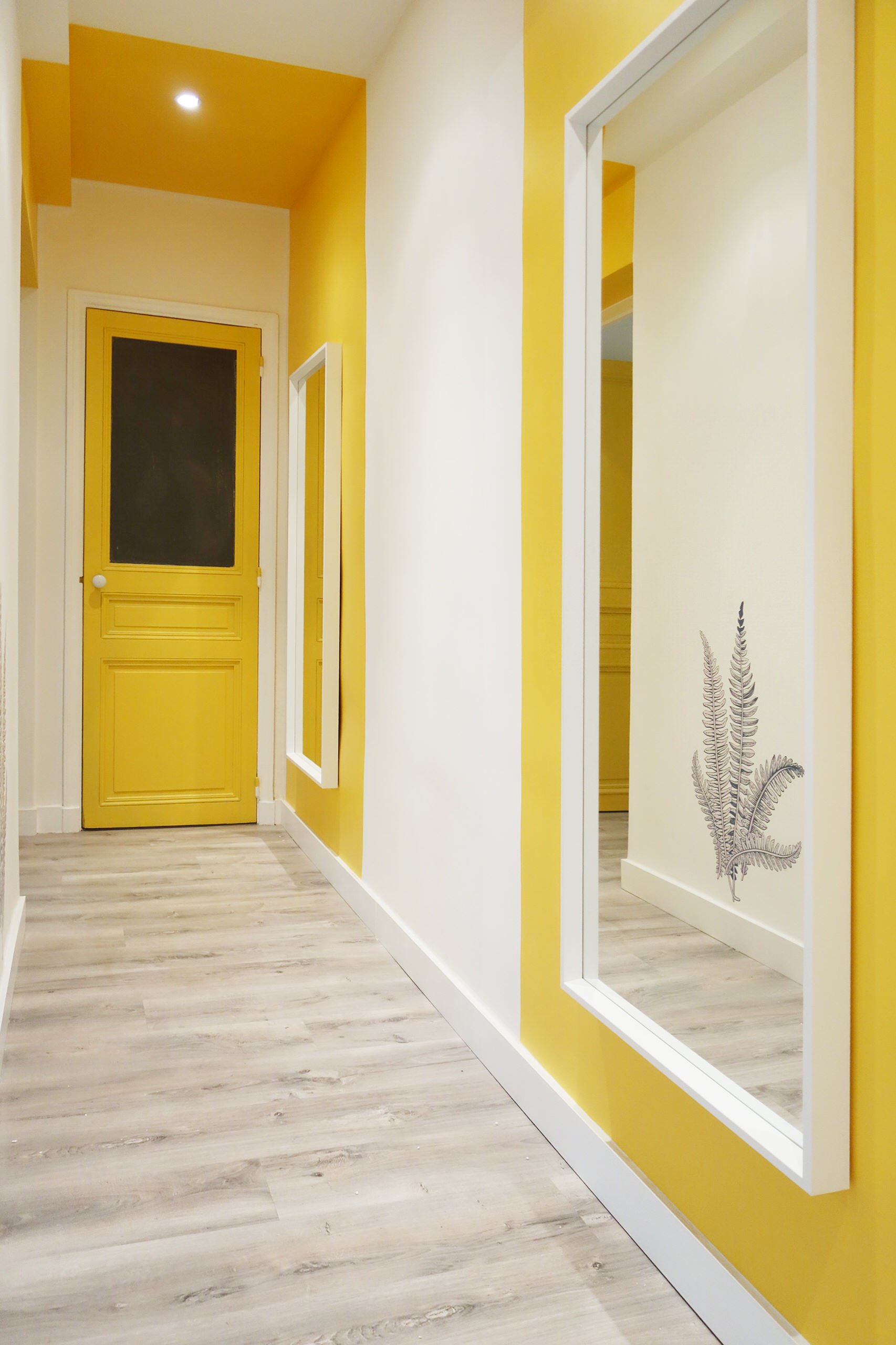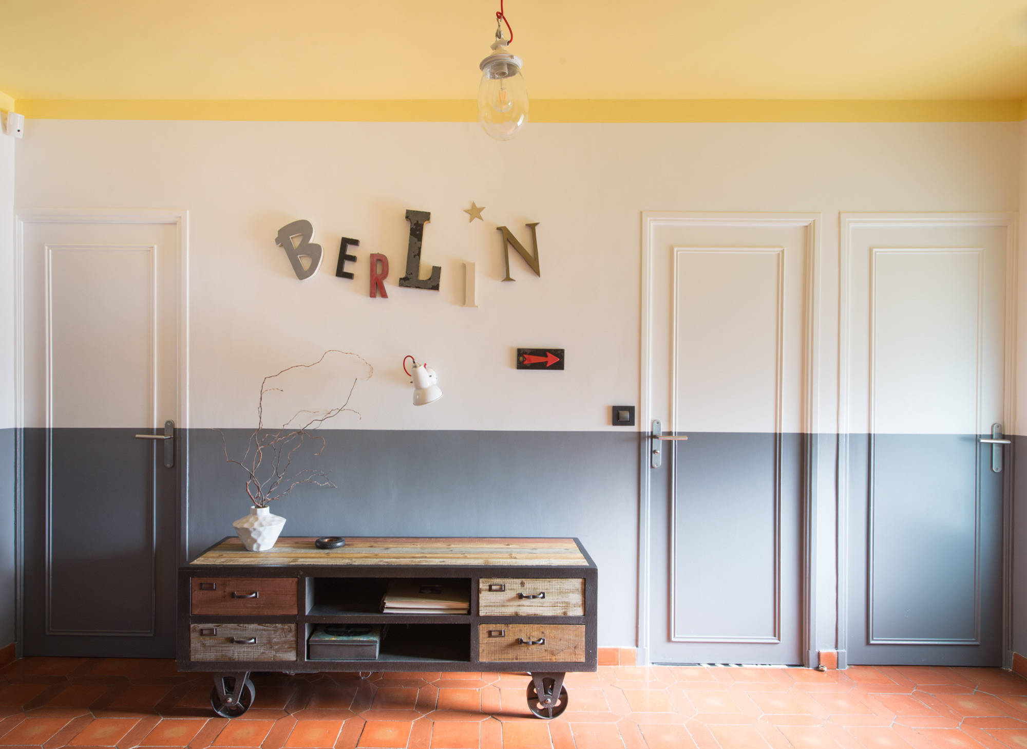 Ce couloir déco a été transfiguré par deux rayures apposées sur le fond blanc. Le plafond ensoleillé contraste avec un soubassement gris qui mime les boiseries des demeures bourgeoises. L’effronterie de la réalisation est double : la bande jaune de plafond vient mordre légèrement sur les côtés et la bande grise se prolonge sur les portes pour les intégrer au décor.