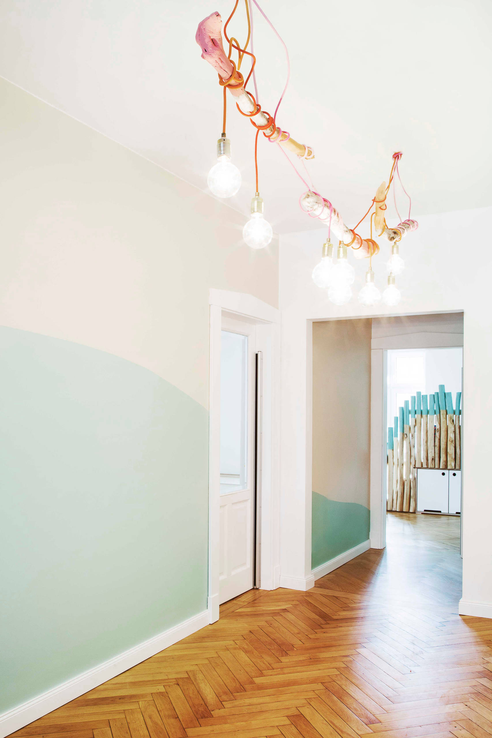 Dans ce logement hambourgeois, une colline vert céladon semble se profiler sur l’un des côtés du couloir et donne une vraie bouffée de nature à cette circulation trop blanche. La métaphore nature est filée au moyen d’une suspension réalisée avec une grande branche d’arbre.
