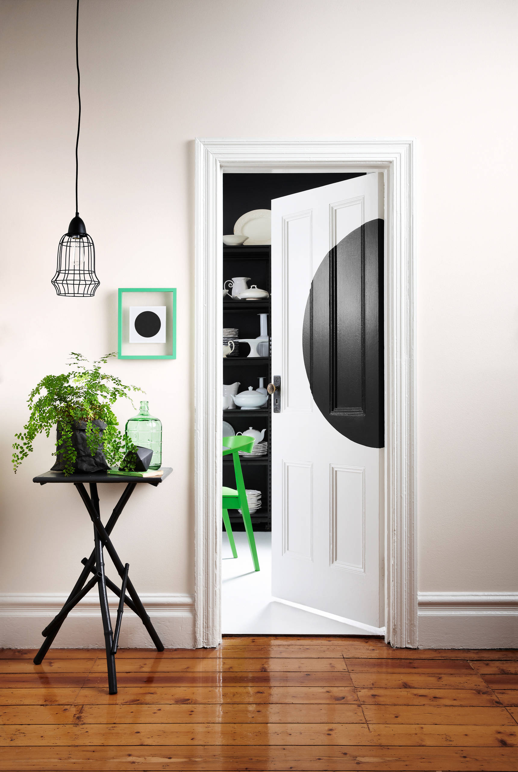 N’hésitez pas à vous amuser avec la couleur et à peindre des formes sur une porte pour égayer une entrée, un hall… Ici à Melbourne, le demi-cercle noir joue à annoncer le thème de la pièce de façon inversé. Le motif noir se dessine sur la porte blanche. Dans la pièce, des formes blanches ornent les murs noirs.