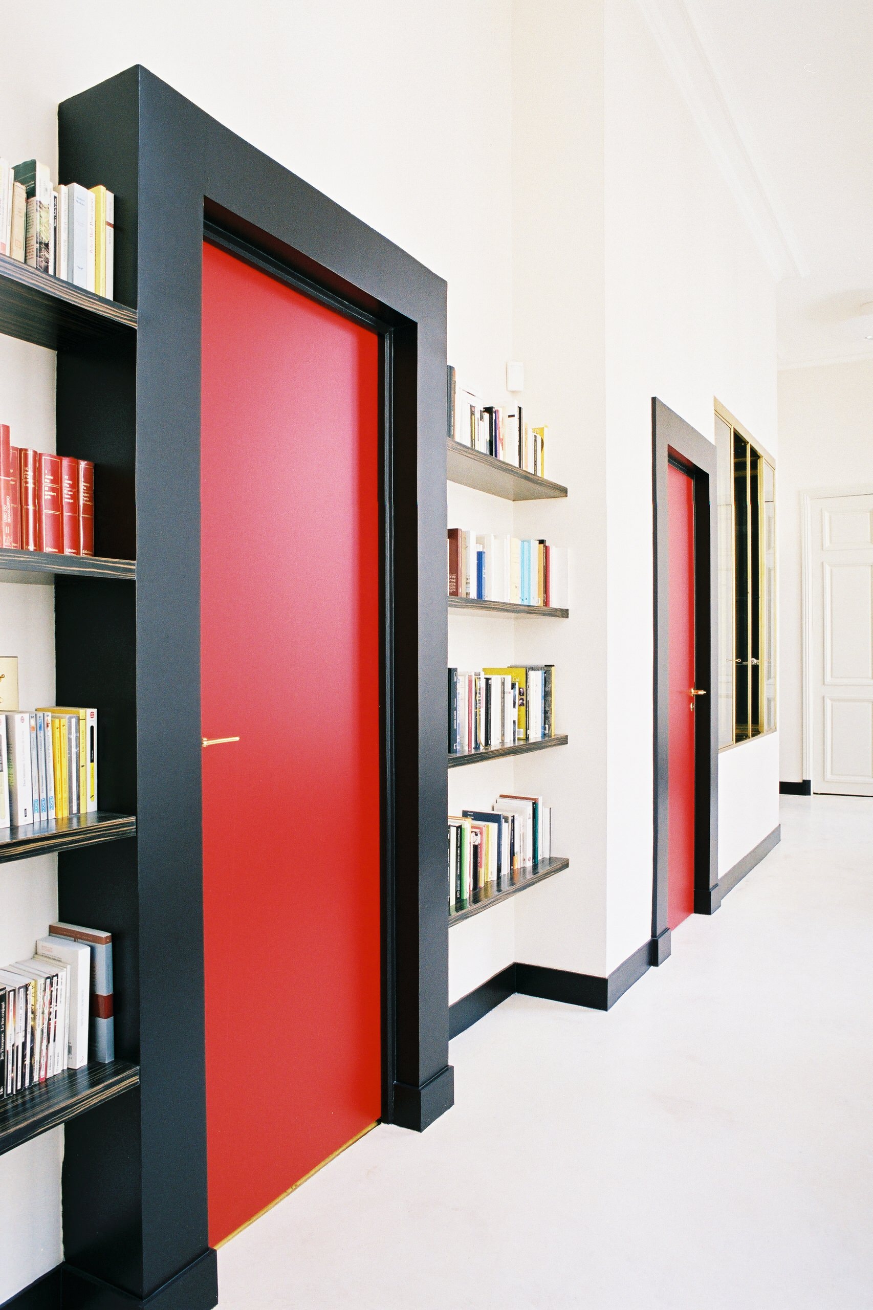 Ce couloir repéré dans le Marais, à Paris, est un modèle de design. Les portes ont été peintes en rouge et rehaussées d’un large encadrement noir. Pour allonger les lignes horizontales, des étagères peintes en noir servent de bibliothèque.