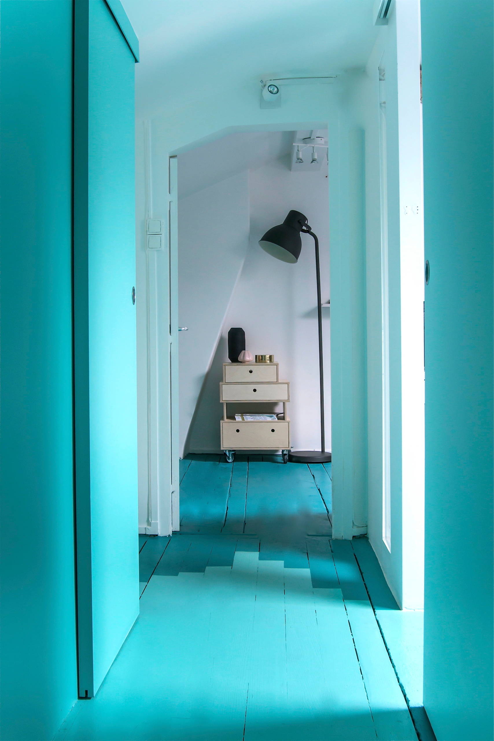 Le turquoise n’est pas commun pour relooker un couloir mais il aura l’avantage de marquer les esprits. Cette réalisation parisienne s’appuie sur deux turquoises, clair et plus foncé, et sur un raccord des deux peintures en « escalier » au niveau du centre du couloir. Osez !