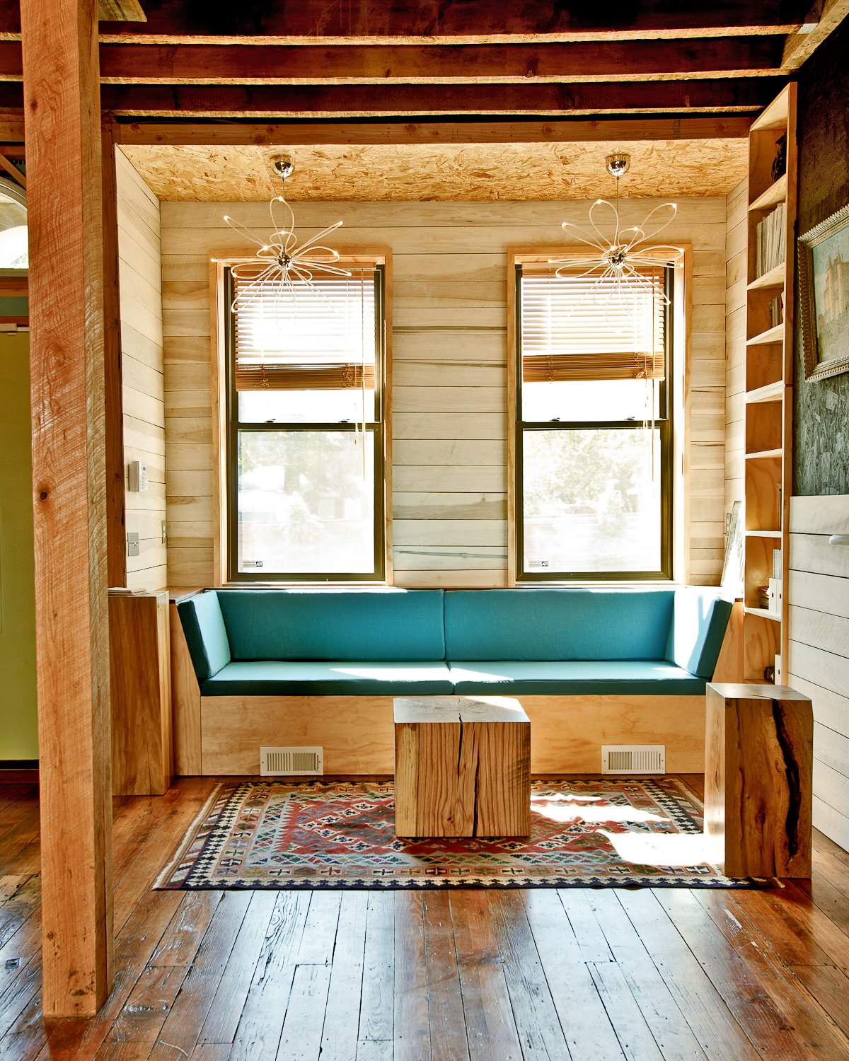 Pour réaliser les cloisons, c’est en effet l’alternative idéale au Placoplatre. Beaucoup plus simple à manier et à installer, il ne fait pas de poussière. Sa teinte blonde se marie particulièrement aux couleurs vives, comme ici dans deux chambres jumelles déclinées en turquoise et corail. Une association qui peut paraître radicale mais que nuancent subtilement les panneaux de bois.