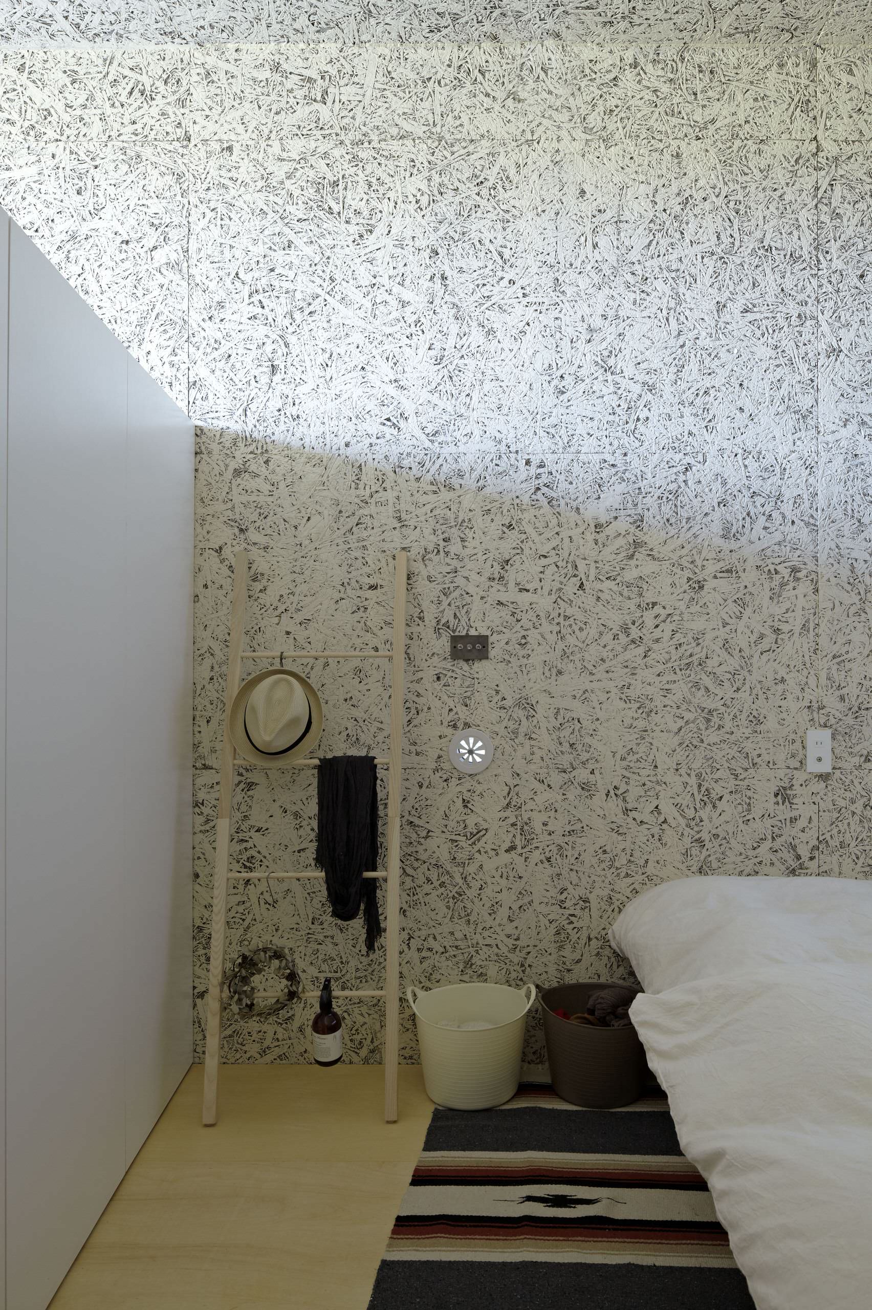 Au même titre que le bois naturel, le bardage brut, le parquet vernis, le contreplaqué ou les poutres sans apprêt, l’OSB fait désormais partie des matériaux qui ont trouvé leur place dans la décoration actuelle, forte d’essentiel et de simplicité. Laissé brut comme dans l’alcôve ci-dessus, il accroche particulièrement la lumière.