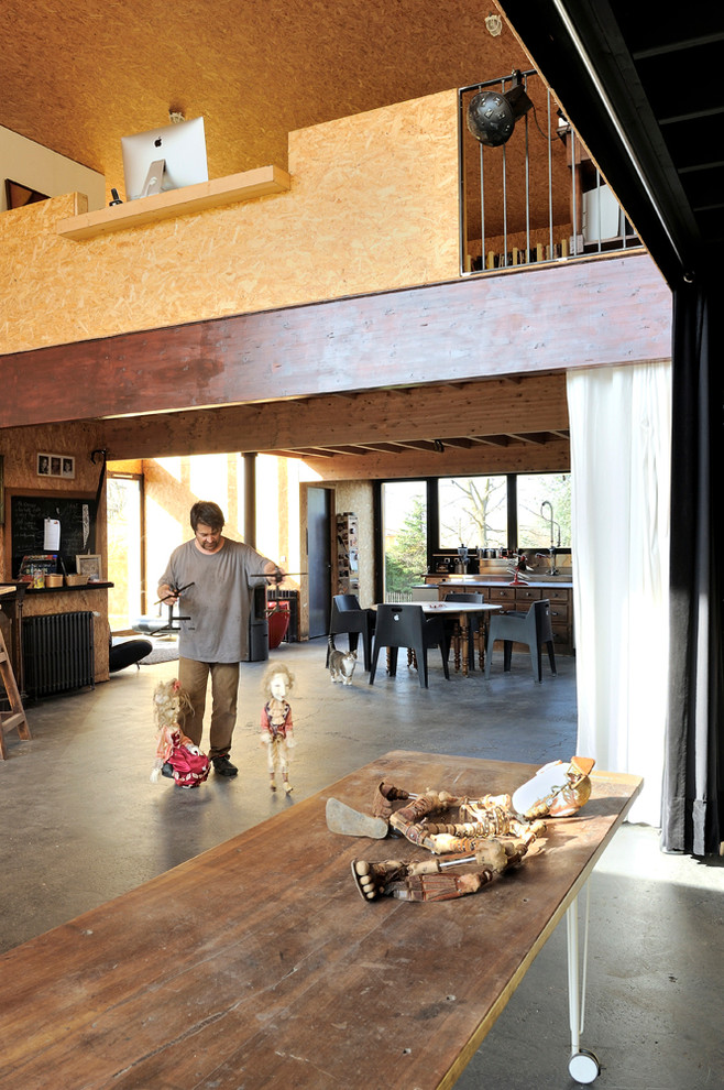 « Dans ce projet d’atelier-home pour un marionnettiste, nous l’avons choisi autant pour des raisons économiques qu’artistiques », explique l’architecte Fabien Perret. « Son utilisation revient moins cher que l’association Placo-peinture. Mais surtout, il se dégage des panneaux d’OSB une esthétique qui me fait penser à une tapisserie au naturel. Un effet que l’on ne trouve pas ailleurs et qui constitue un élément décoratif à lui seul. Il se marie très bien aux touches de couleurs vives ou aux tonalités grisées du béton. »