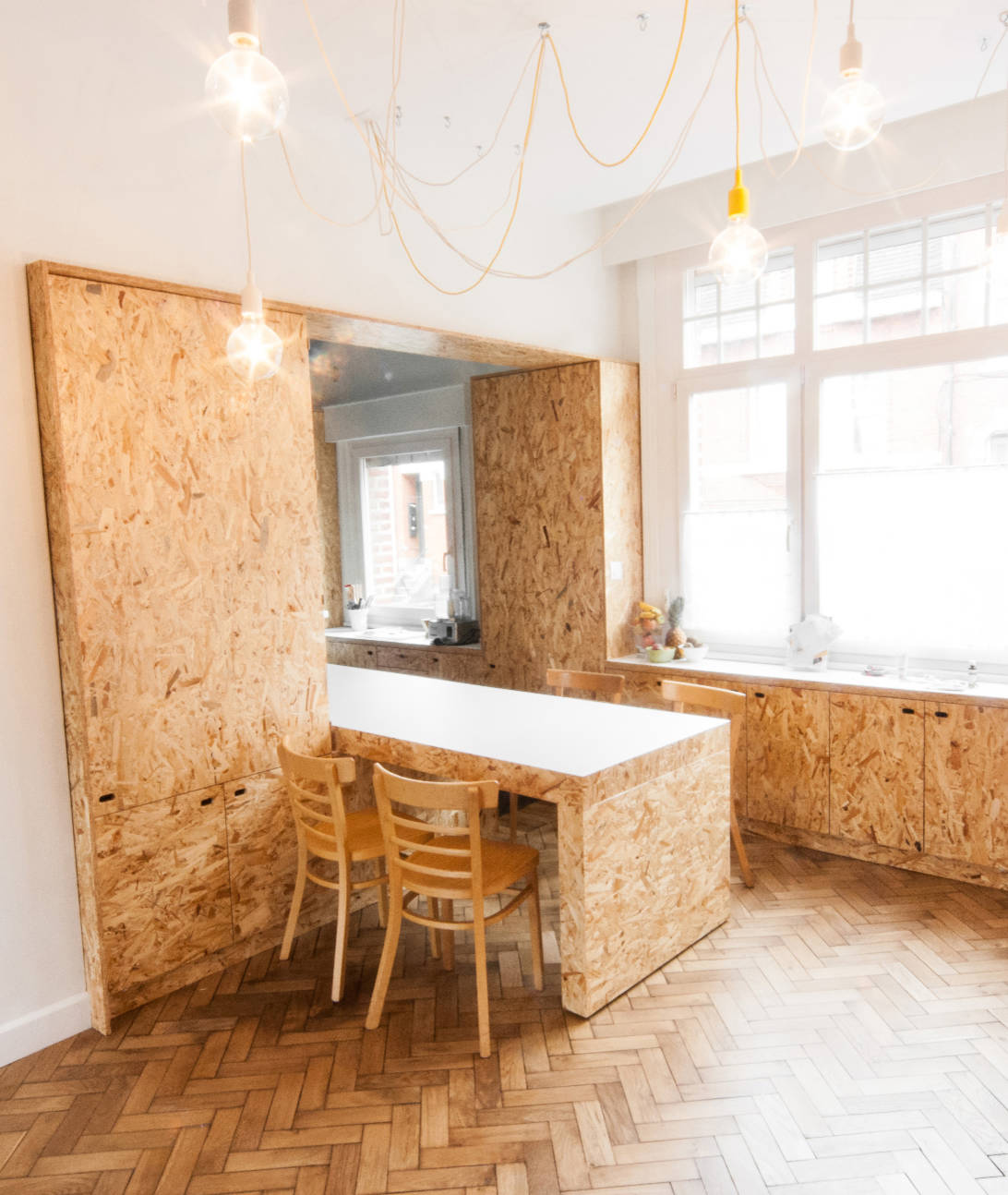 En bloc, comme dans la cuisine ci-dessus, ou en touches, l’OSB apporte une perspective très contemporaine aux aménagements, surtout dans des intérieurs classiques. Dans l’appartement ci-contre à l’étage d’une maison ancienne, l’agence Dientre a recomposé l’espace de vie principal en l’agrandissant. Le meuble du fond cache un bureau, la table voyage entre l’espace salon et la cuisine cachée de l’autre côté des portes. Les panneaux agglomérés offrent ainsi beaucoup de modularité et de fonctionnalité.
