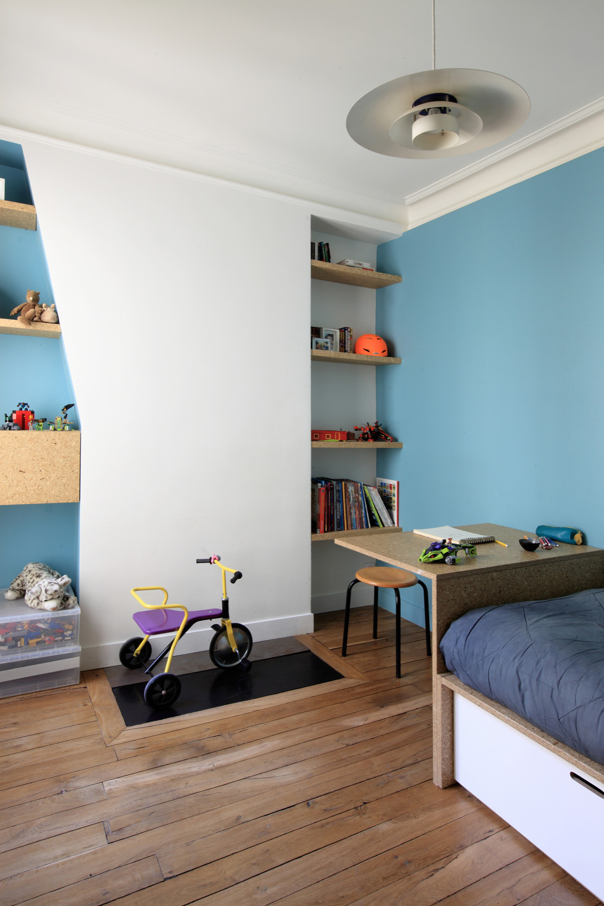 Dans le reste de l’appartement, l’agglo a aussi servi à mettre en place de nombreux rangements et à faciliter l’organisation de l’espace de chacun. Dans une des chambres de garçon, les panneaux ont permis de construire le lit et le bureau, ainsi que des coffres et des étagères autour de l’ancien conduit de cheminée. Une modernisation en douceur des lignes classiques de l’appartement. À noter, la jolie association avec les teintes vives comme ici avec un bleu givré.