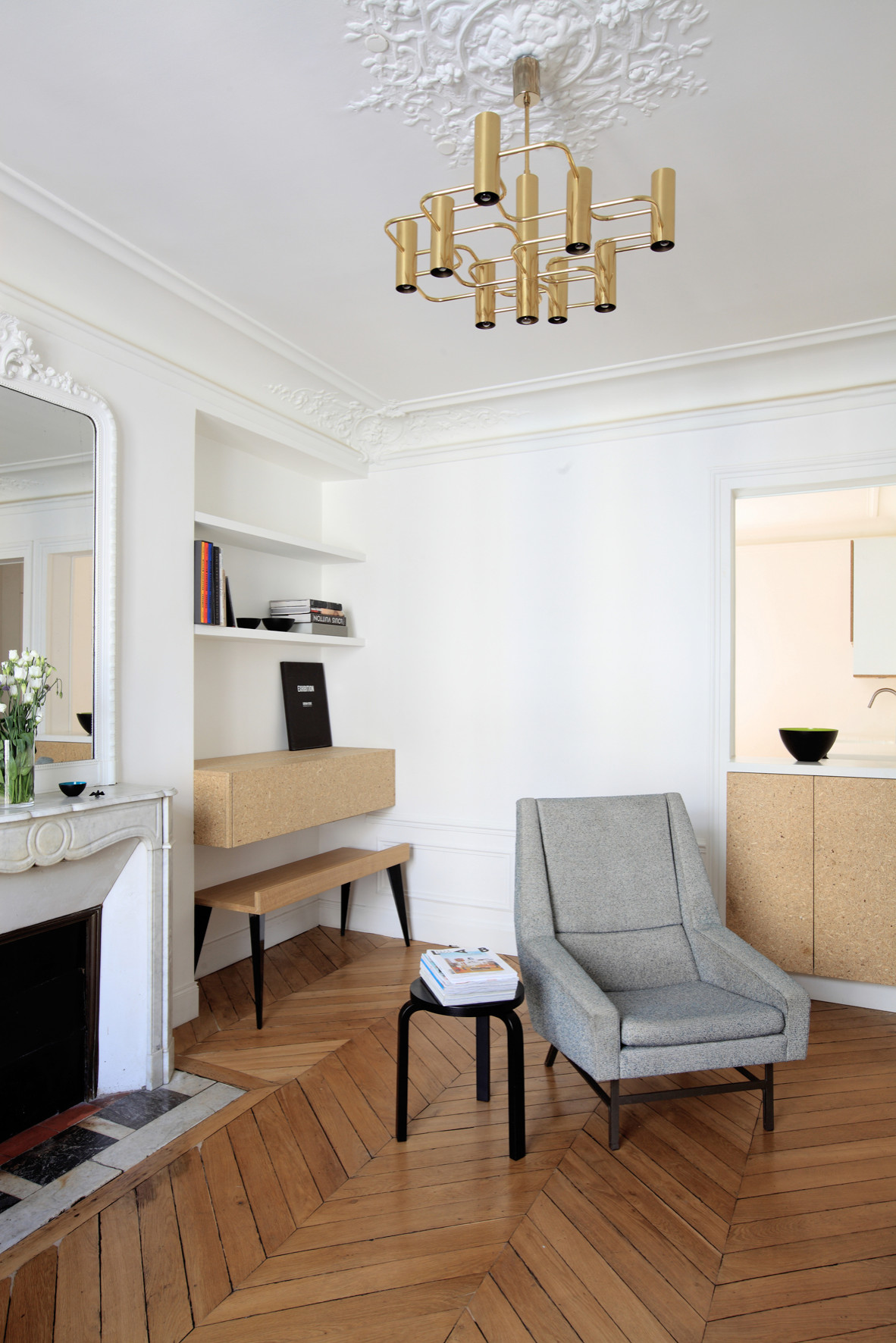 C’était l’objectif de l’atelier Premier Étage pour ce chantier de rénovation d’un appartement haussmannien dans le 10e arrondissement parisien. « Les lieux étaient en très mauvais état et très cloisonnés, comme dans tous les appartements classiques », se souvient Claire Escalon, une des deux designers de l’agence. « Nous avons voulu proposer à nos clients un projet radical, en cassant les repères bourgeois des lieux grâce à des aménagements en aggloméré. »