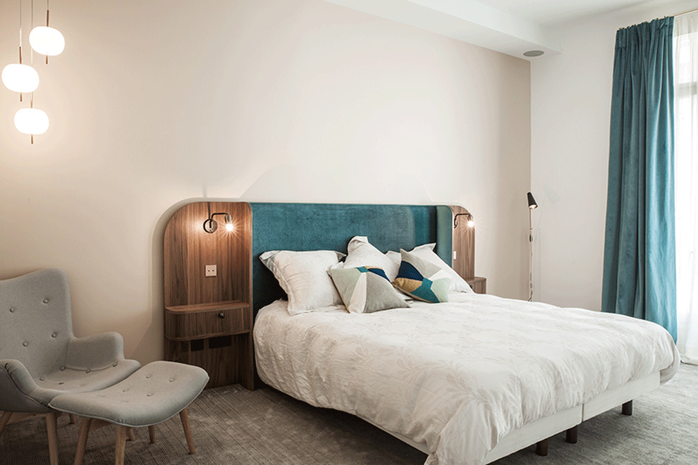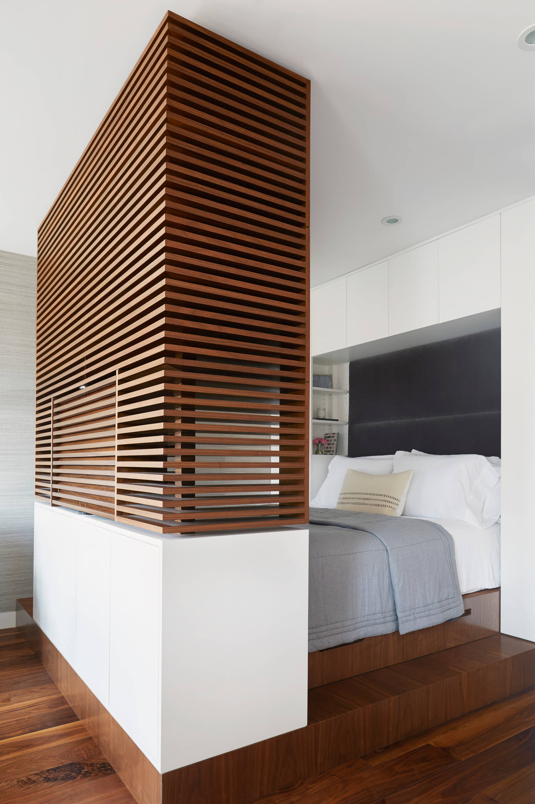 Dans cette chambre contemporaine de Toronto, le choix de textures douces et de motifs sobres, place ce lit en noyer au cœur d’une ambiance cosy et indémodable.