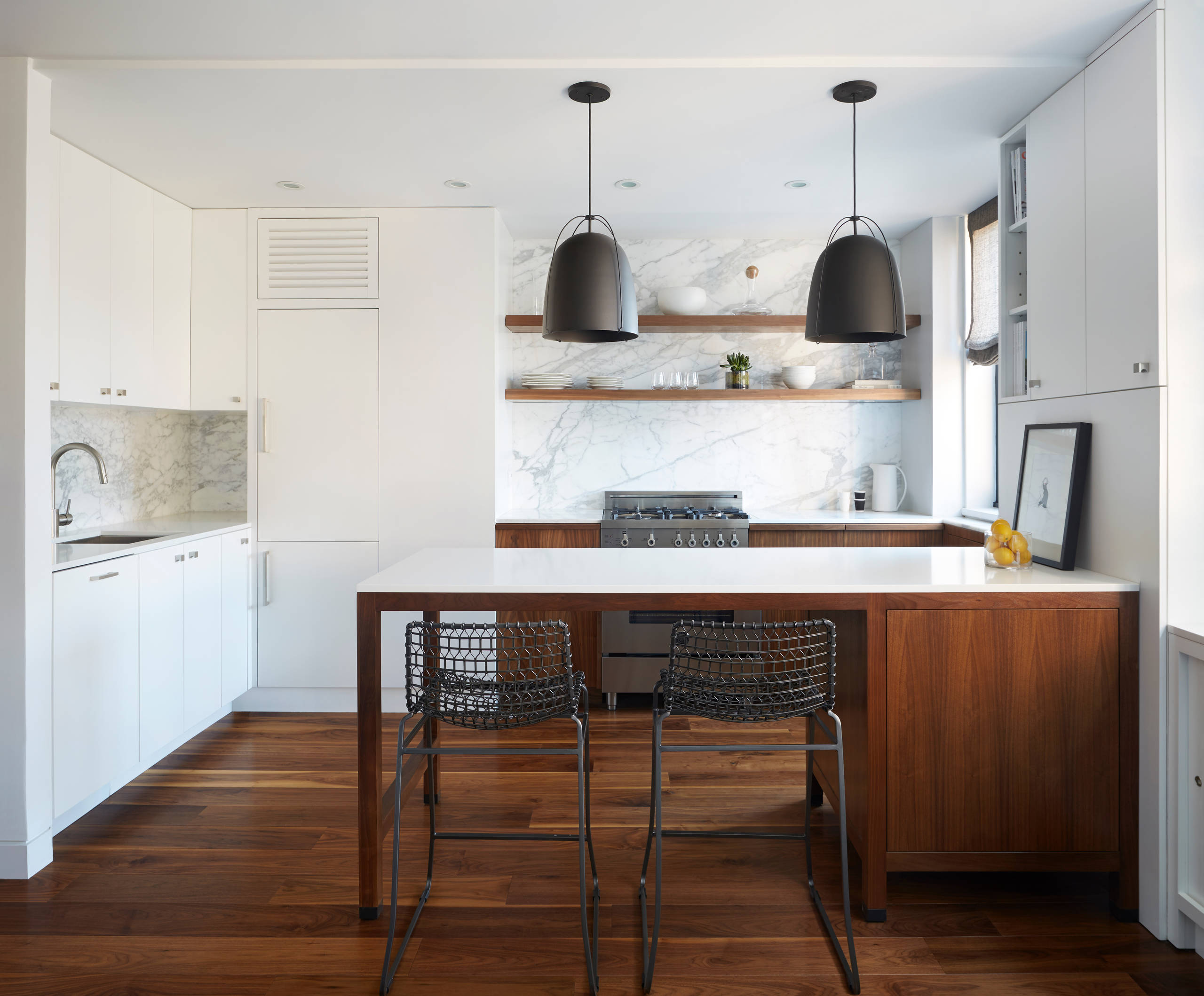 Il n’est pas question que des matériaux aussi nobles soient-ils, restent figés dans des époques révolues. Ainsi, pour la rénovation de cet appartement new-yorkais, le choix du noyer s’est imposé en parquet, mais aussi en claustra contemporain, qui compose une chambre en second jour. Dans la cuisine, il s’accorde aussi avec le marbre revisité également… en crédence !