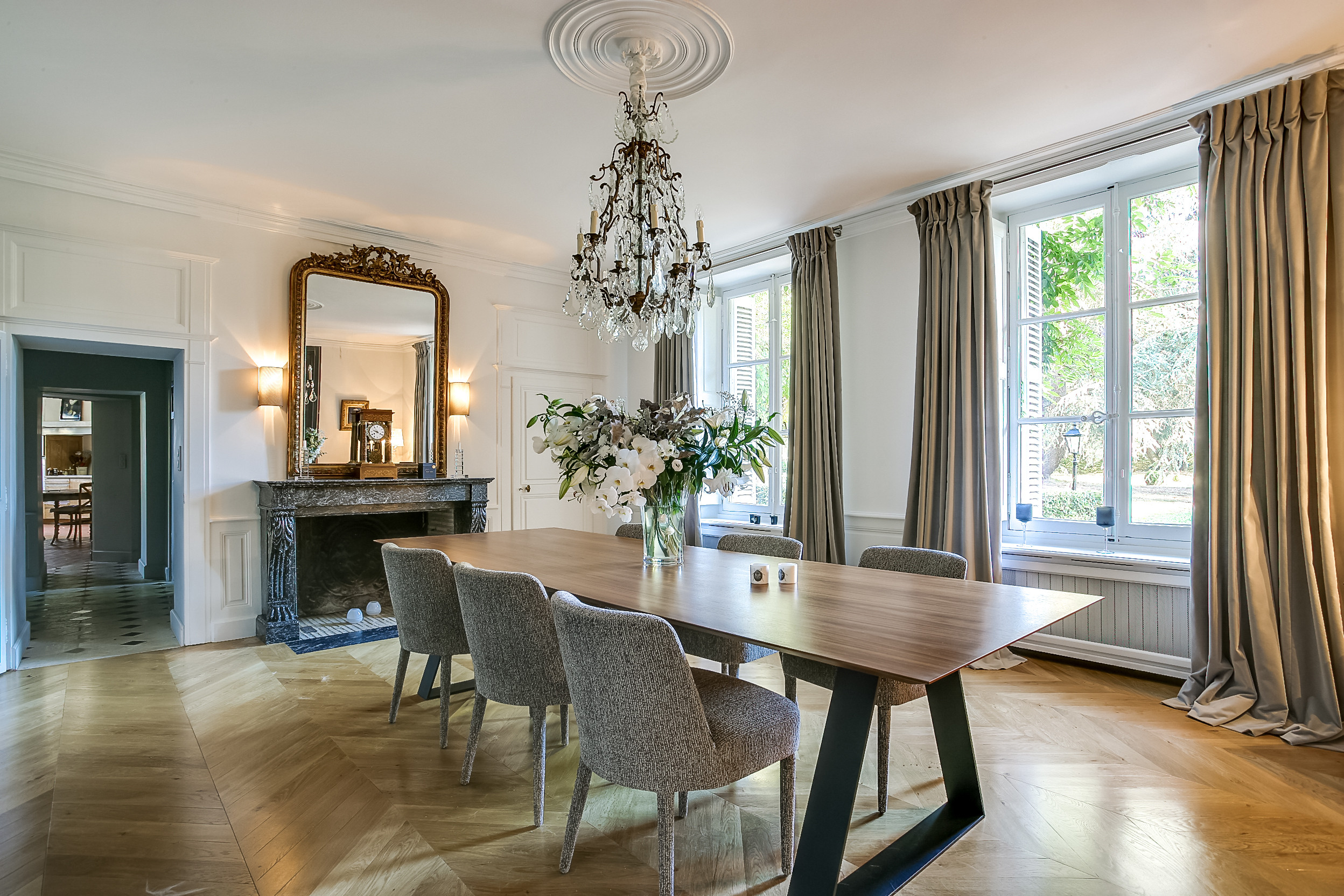 Retenez l’idée : pour revisiter une ambiance classique, associez une table en noyer avec des chaises en tissus. Inspirez-vous de cette gentilhommière du XVIIIᵉ siècle dans la Vallée de la Loire. Le piétement de la table pourra être en métal : acier peint en noir ou laiton.