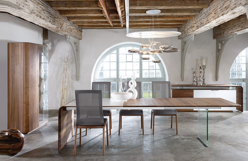 Les plateaux de tables en noyer, softs, solides et chics, changent aussi de piétement. Dans cette salle à manger lilloise, l’idée est de combiner luxe et design. Tandis que le plateau en noyer descend au sol à angle courbé et en guise de piétement, le second pied n’est autre qu’une plaque de verre épaisse et transparente.