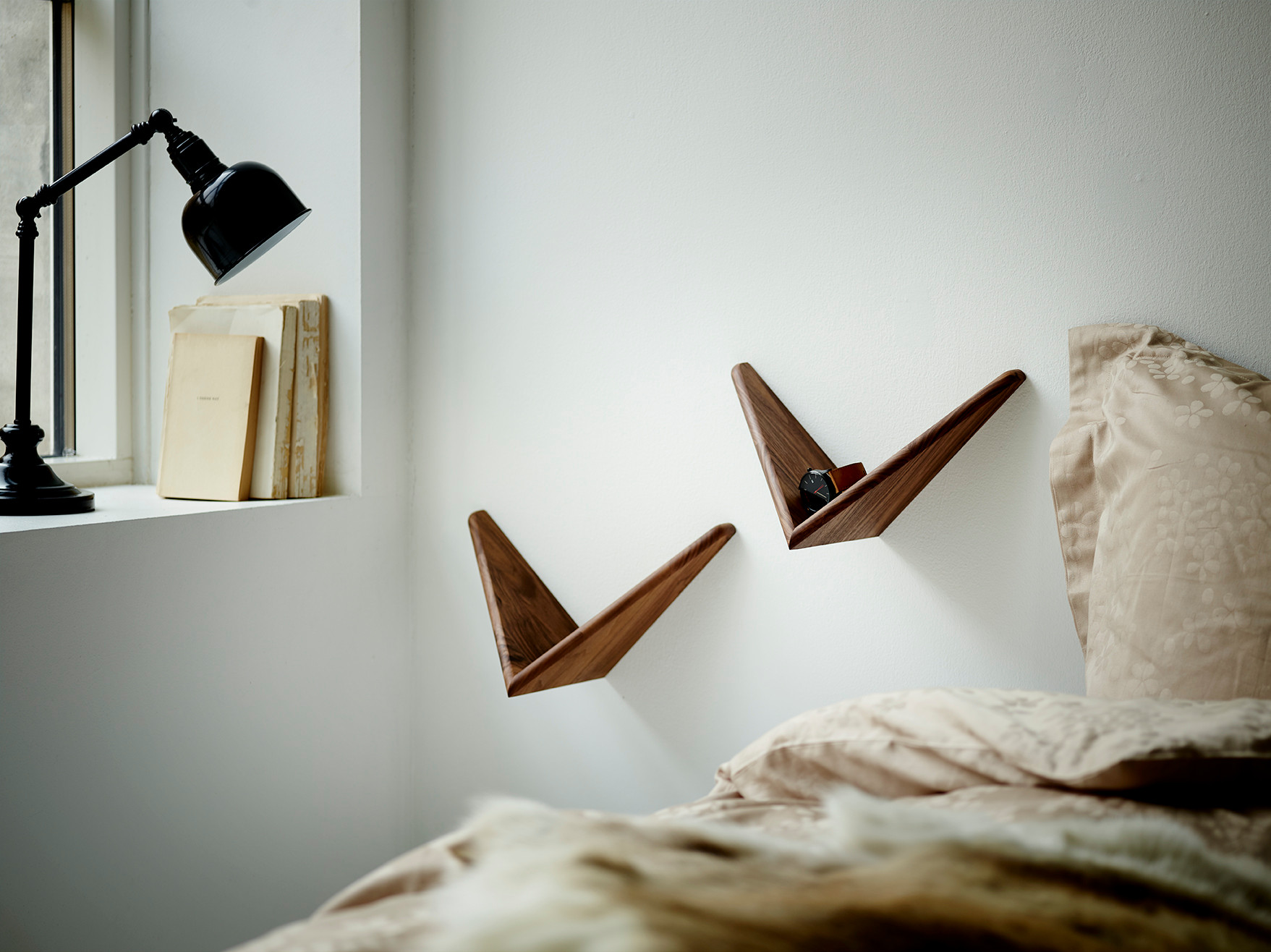 Si son prix au mètre cube demeure élevé en raison de sa rareté, il suffit de quelques accessoires décoratifs en noyer pour donner du charme à votre intérieur. Par exemple ces étagères triangulaires assemblées en forme d’oiseaux habillent élégamment un chevet de lit. Des bols ou assiettes en bois tourné apportent aussi une note élégante aux tables et consoles.