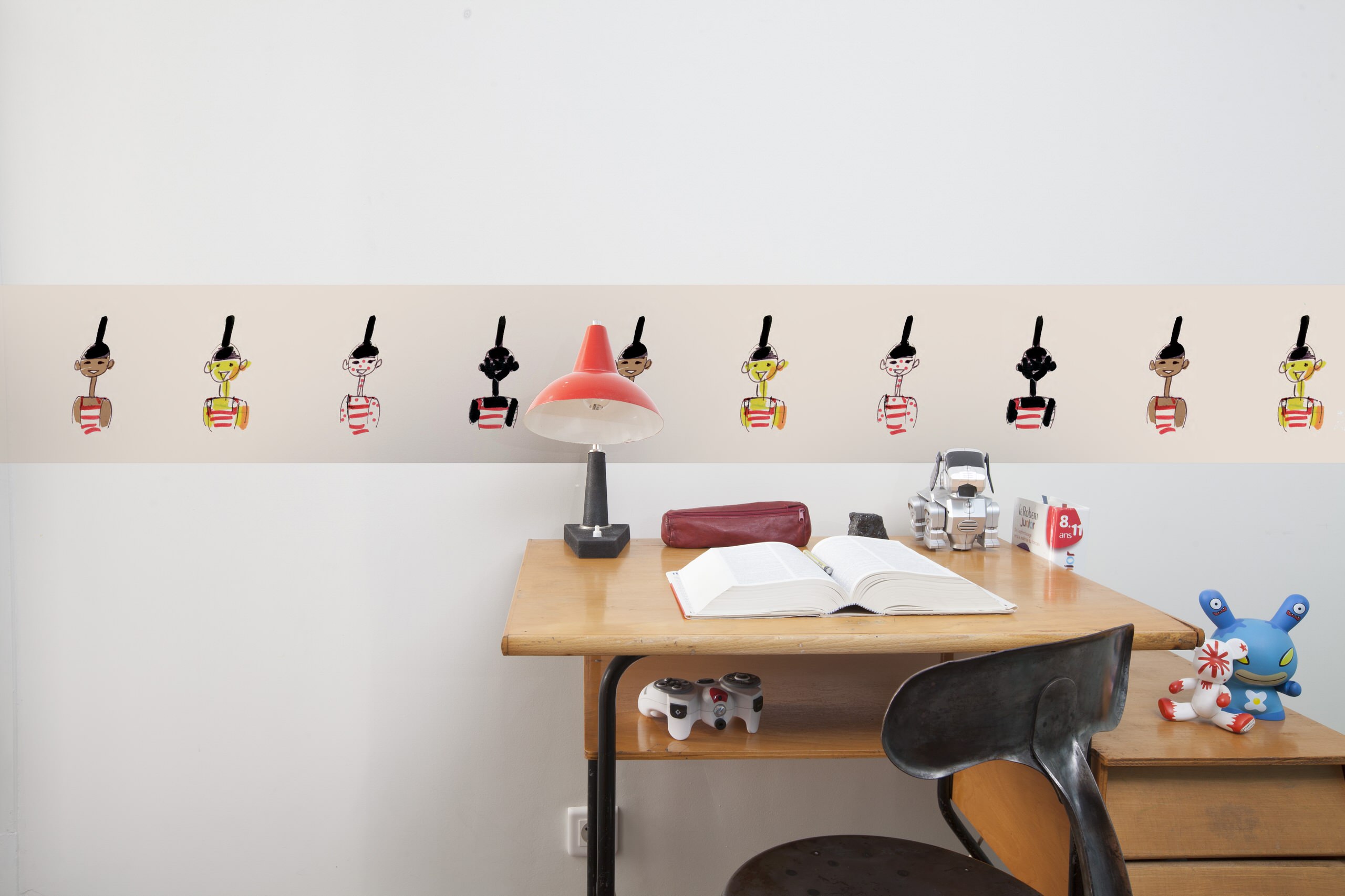 Certains éditeurs ont bien saisi cette envie de décor express et sont allés encore plus loin dans la facilité de pose en proposant des lés pré-encollés. « Il n’est même plus besoin d’acheter un rouleau. Il suffit de vaporiser l’envers du lé, de le poser au mur et de le maroufler. Et en 5 minutes, vous avez changé votre décor », explique olivier Albert. Ci-dessus, le Mini Lé de Beauregard, une frise aux accents Art déco posée en guise de crédence.