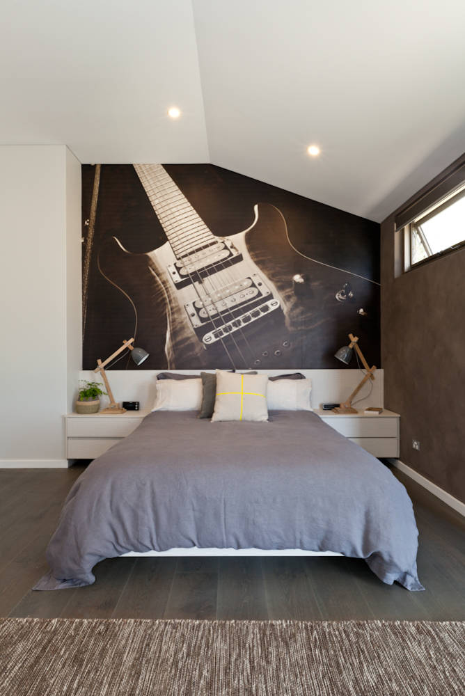 Certaines maisons d’édition avant-gardistes, à l’instar de Scenolia, se lancent même dans le sur-mesure. Pour une personnalisation ultime, osez faire imprimer sur papier peint intissé l’une de vos photos, à la taille exacte de votre mur, comme ici cette guitare. « Pour un mur classique de 3 mètres de large sur 2,70 mètres de haut, il est important de fournir un visuel de très bonne qualité », insiste Olivier Albert. « Je vous recommande d’employer un Reflex professionnel affichant 16 millions de pixels, ou du bon matériel photo grand public 20 millions de pixels. »