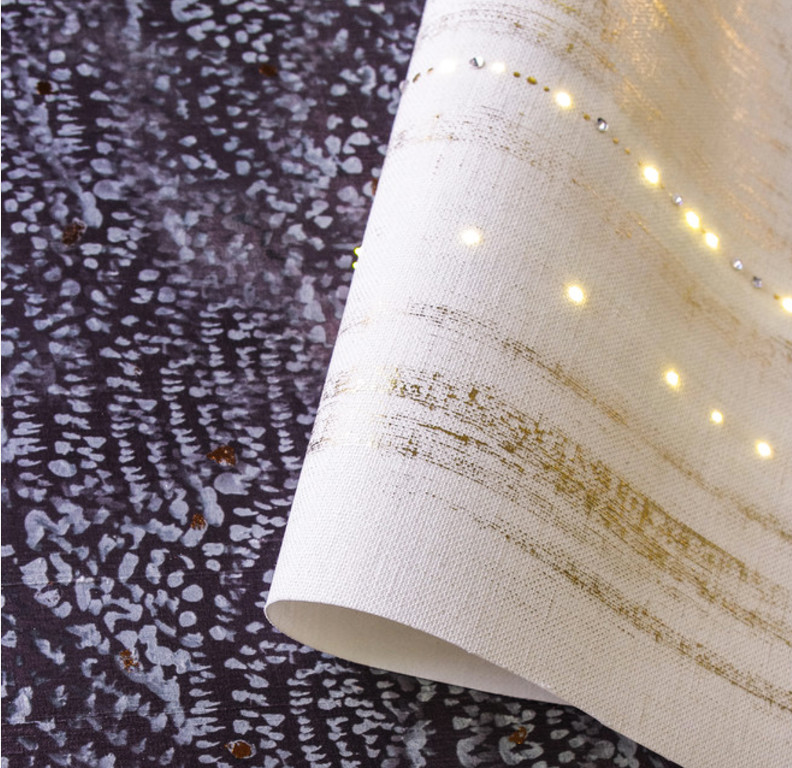 Question motifs, l’intissé présente au moins autant de variétés que le papier peint traditionnel, de l’uni aux motifs les plus originaux en passant par les décors classiques. À noter que les nouvelles technologies, permettant aujourd’hui une dépose sélective de l’encre, ont engendré des papiers avec des effets mats et brillants ou, comme ici, avec des ajouts de peinture métallique.