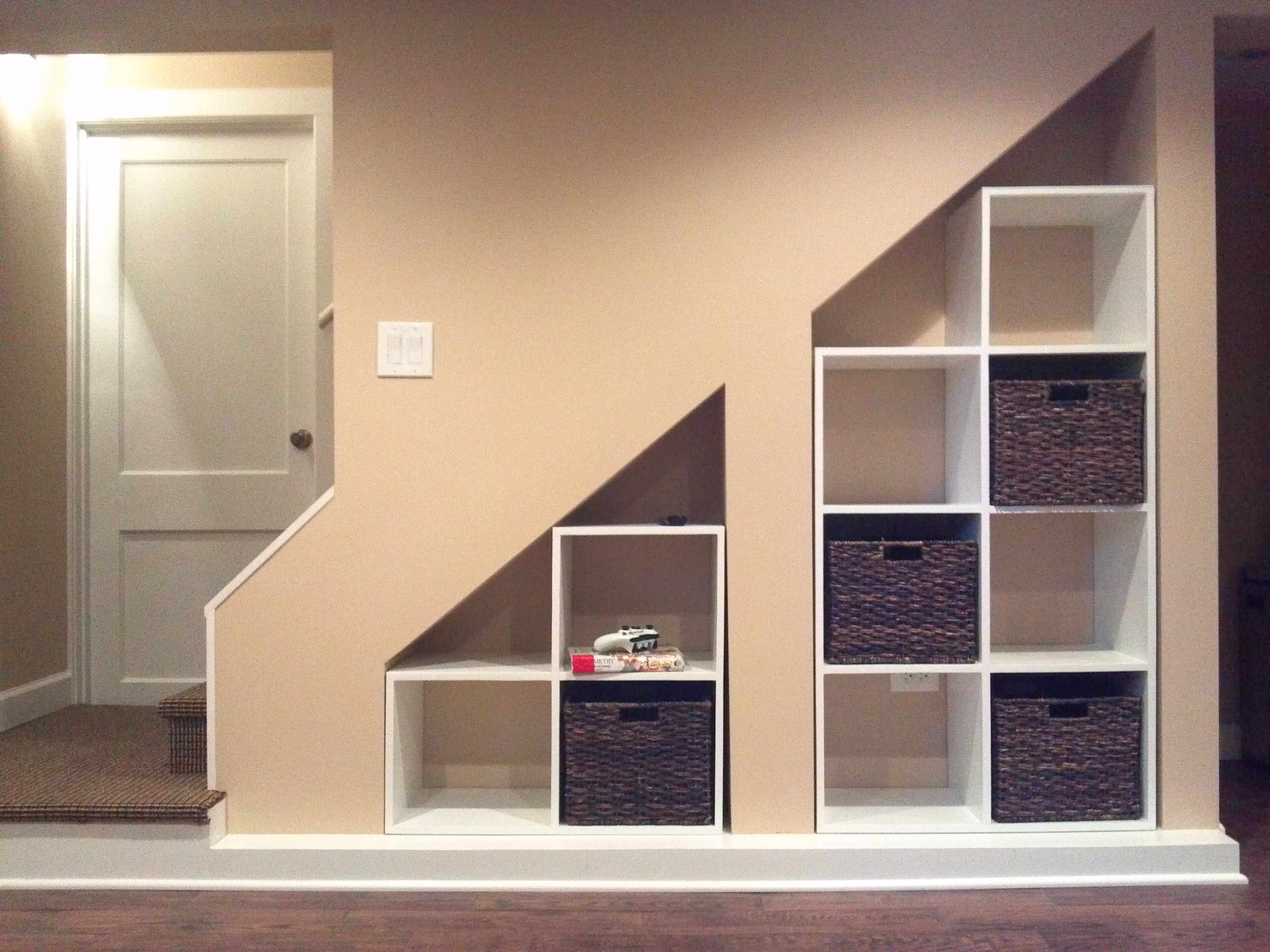 Des casiers en rotin produiront également leur petit effet dans une bibliothèque blanche, avec laquelle ils trancheront. Comme ici, pensez à exploiter au maximum l’espace situé sous votre escalier, pour gagner en espace de rangement, aménager une petite pièce supplémentaire etc.