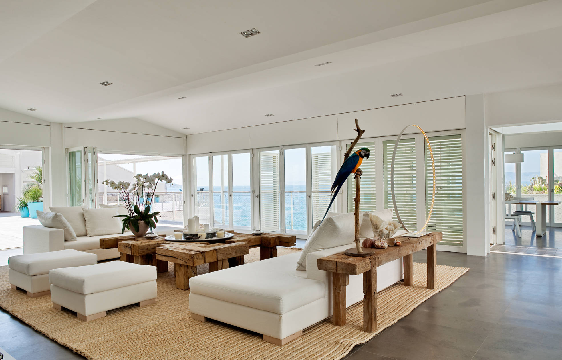 Un tapis XXL en rotin est parfaitement envisageable pour créer une ambiance bord de mer, à la fois contemporaine, authentique et conviviale. Ici, on aime le mariage entre un assortiment d’élégants et larges canapés blancs avec des tables en bois brut et ce grand tapis en rotin. Morale de cette déco : l’ambiance bord de mer peut être élégante à condition de combiner des matériaux naturels et des tonalités neutres.