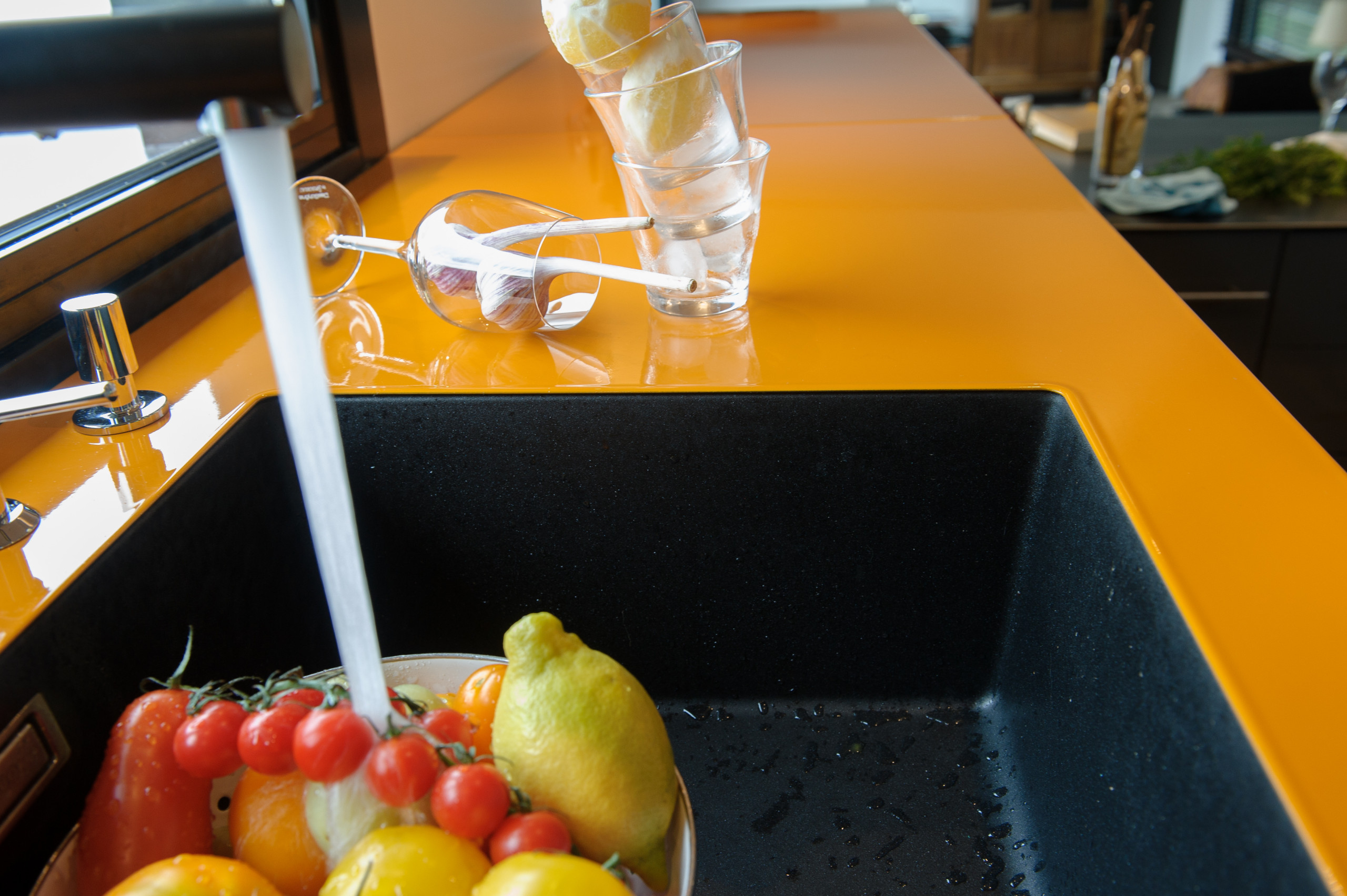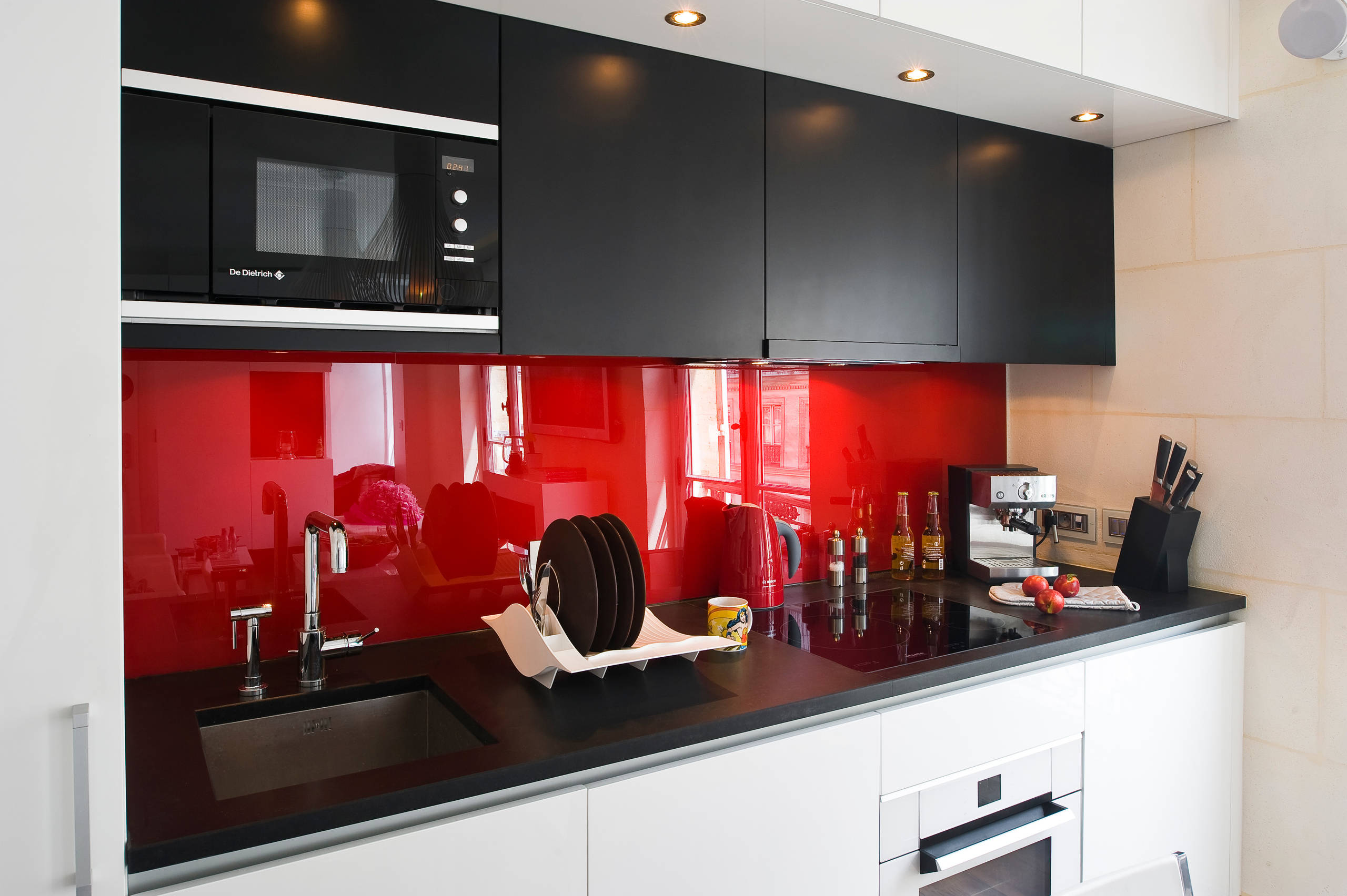 Le verre est également un matériau intéressant en cuisine grâce à ses propriétés inhérentes. Inorganique et neutre en COV (composé organique volatil), il est sain pour la santé, ce qui convient bien à l’endroit où l’on prépare les repas. En prime, comme il est lisse et résistant aux produits classiques de nettoyage, il est particulièrement hygiénique. Les architectes l’apprécient également pour une autre de ses qualités : il peut être brillant et coloré si bien qu’il est très efficace pour donner de la profondeur et du caractère à une petite cuisine lorsqu’on le place en crédence comme ici. « Un verre trempé, à la résistance thermique accrue, est nécessaire si la distance entre le mur et la plaque est inférieure à 6 cm », rappelle Patrick Busalb.