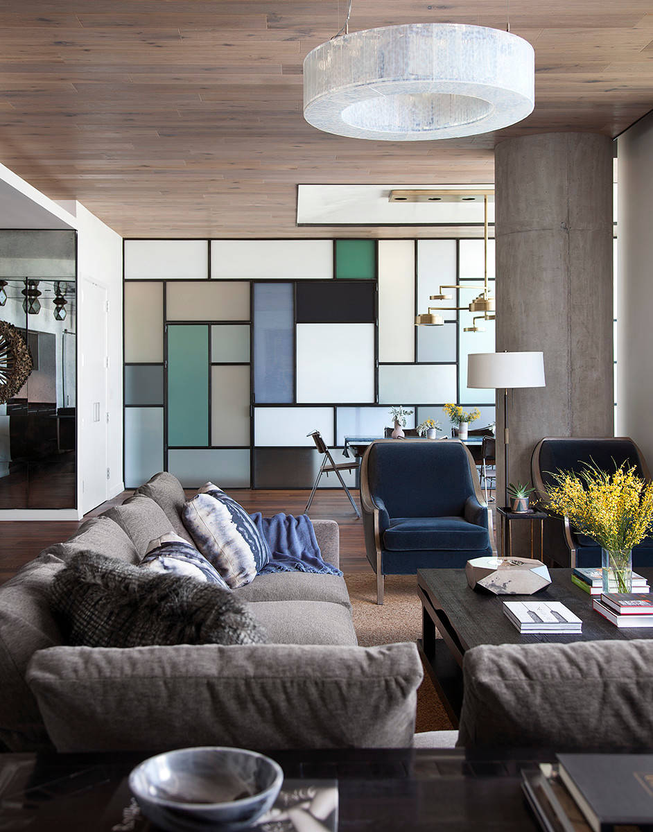 Dans ce salon à Austin, l’architecte d’intérieur a trouvé des qualités supplémentaires à ces vitrages : la possibilité de les tailler sur mesure et leur grand nombre de coloris. Il existe en effet une trentaine de teintes disponibles, à assortir. Ces verres laqués existent comme ici en finition mate ou en finition satinée et brillante.