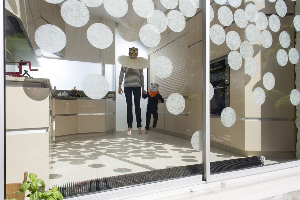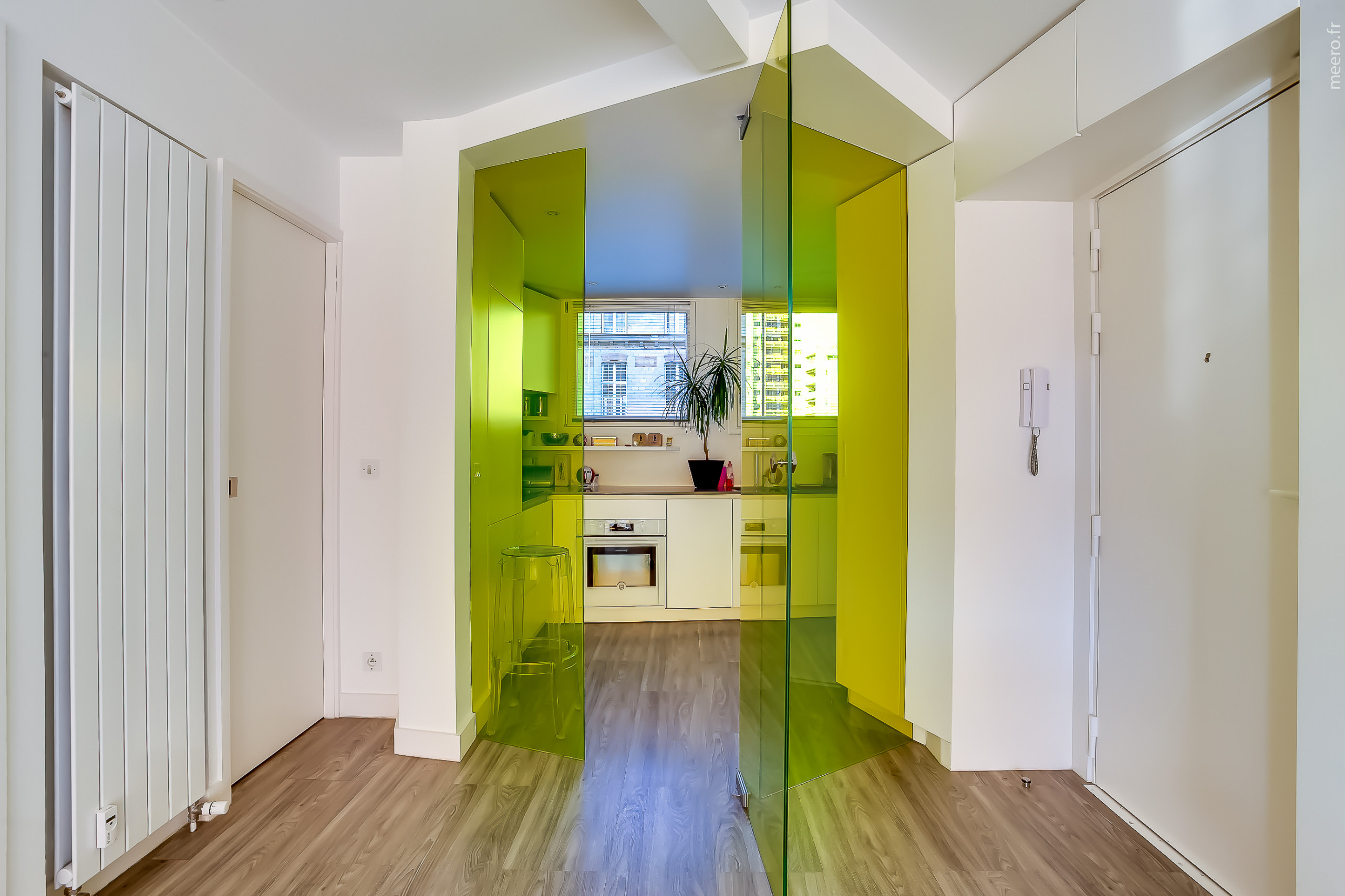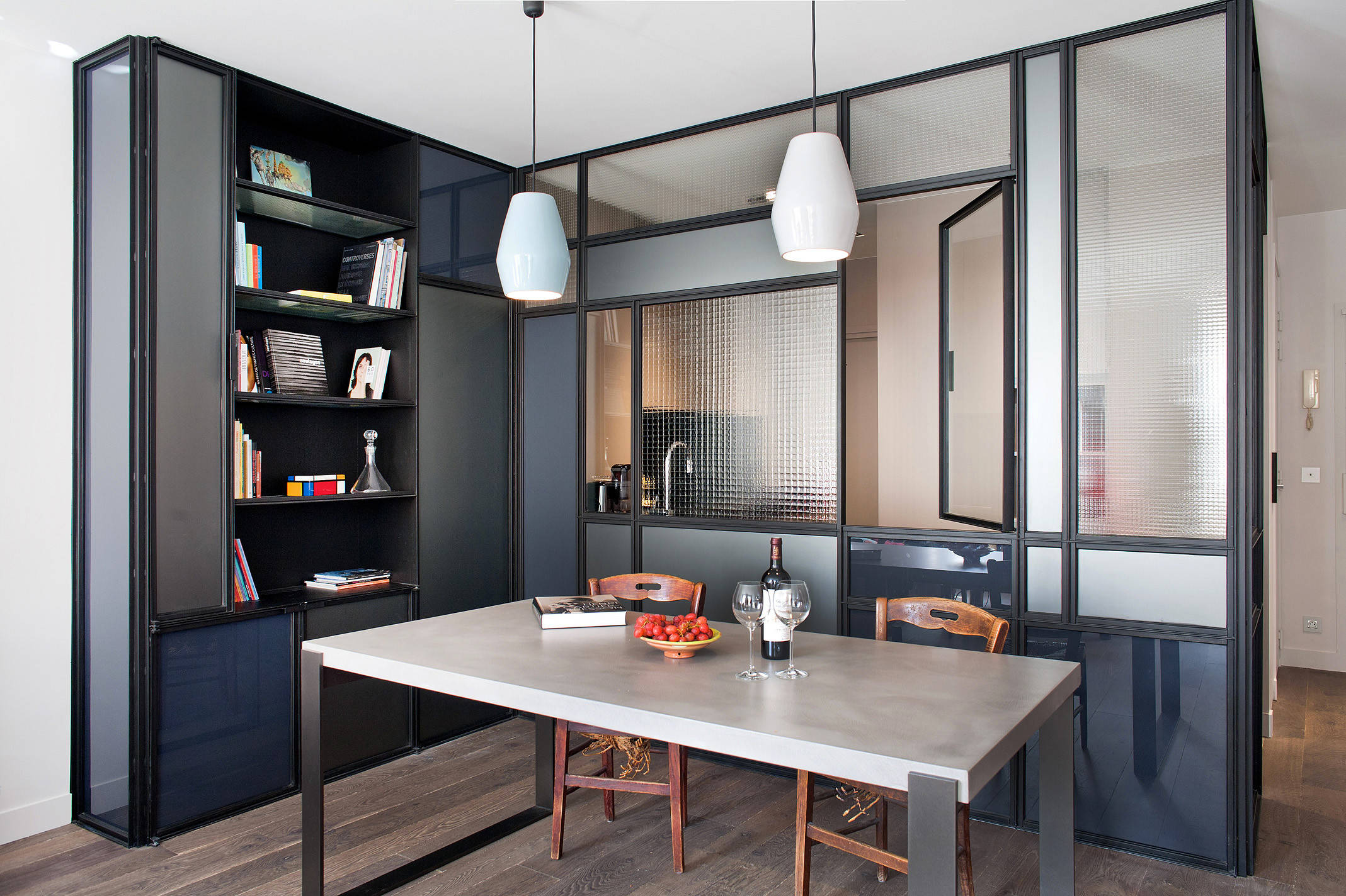 Un autre type de verre translucide, avec différents motifs imprimés a le vent en poupe actuellement. C’est le choix qu’a fait l’architecte d’intérieur Marion Dériot pour équiper cette verrière cloisonnant la cuisine d’un appartement parisien.