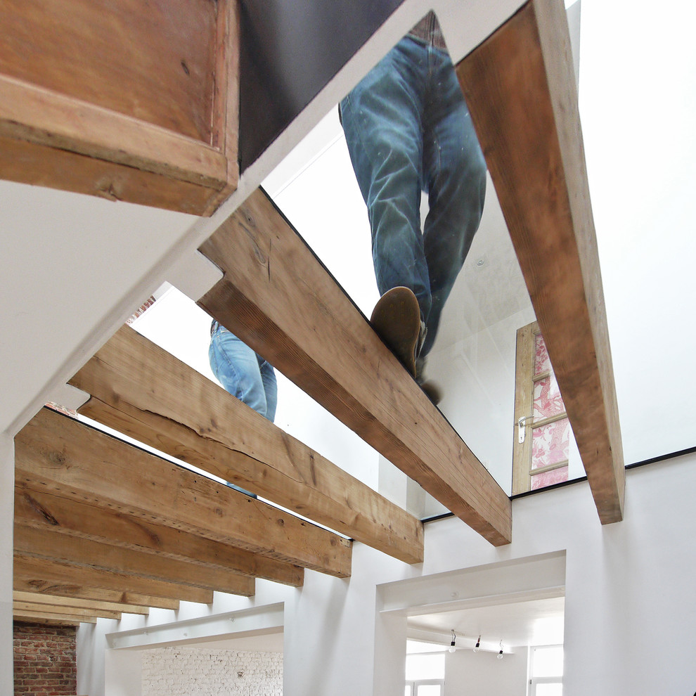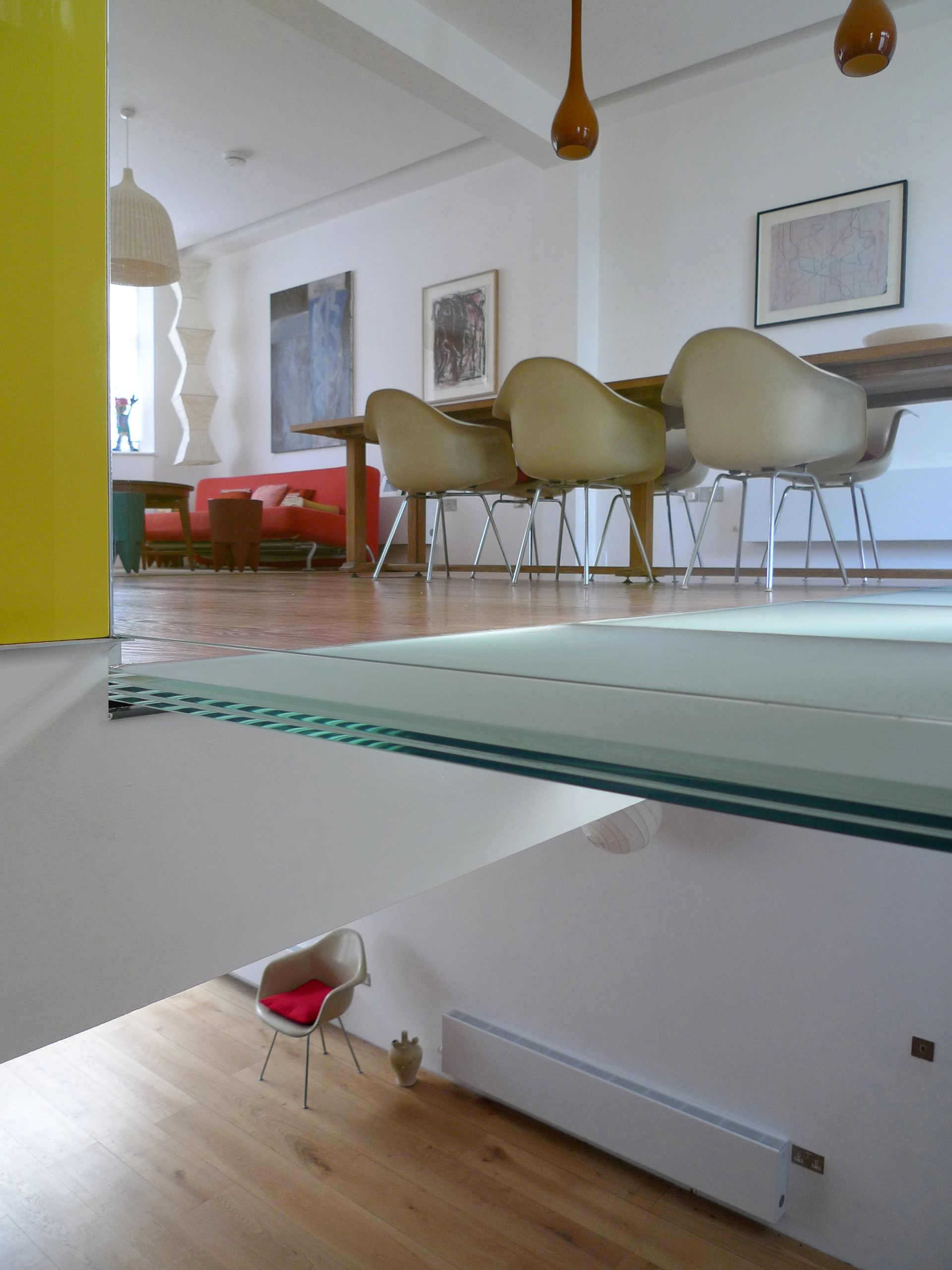 Dernier usage décoratif en intérieur, celui qui concerne l’usage du verre en circulations, et notamment en plancher ou en escaliers. Dans cet emploi on ne fait pas souvent appel à un verre décoratif même si c’est possible. C’est davantage l’usage du matériau verre qui crée la sensation, permis par des assemblages plus techniques. Ici par exemple, dans cette maison de Londres, un sol de verre crée une coursive osée au premier étage, apportant beaucoup de légèreté, de lumière, et au final d’originalité, à la réalisation.