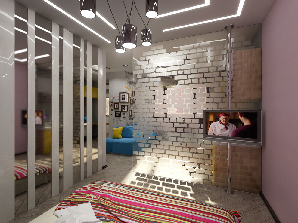 Dans ce loft moscovite, une cloison en verre sérigraphié avec des motifs de brique sert à différencier les espaces tout en restant légère et lumineuse. Le motif a été créé à la surface du vitrage par la technique du rouleau encreur sur pochoir appliqué à froid sur la surface.