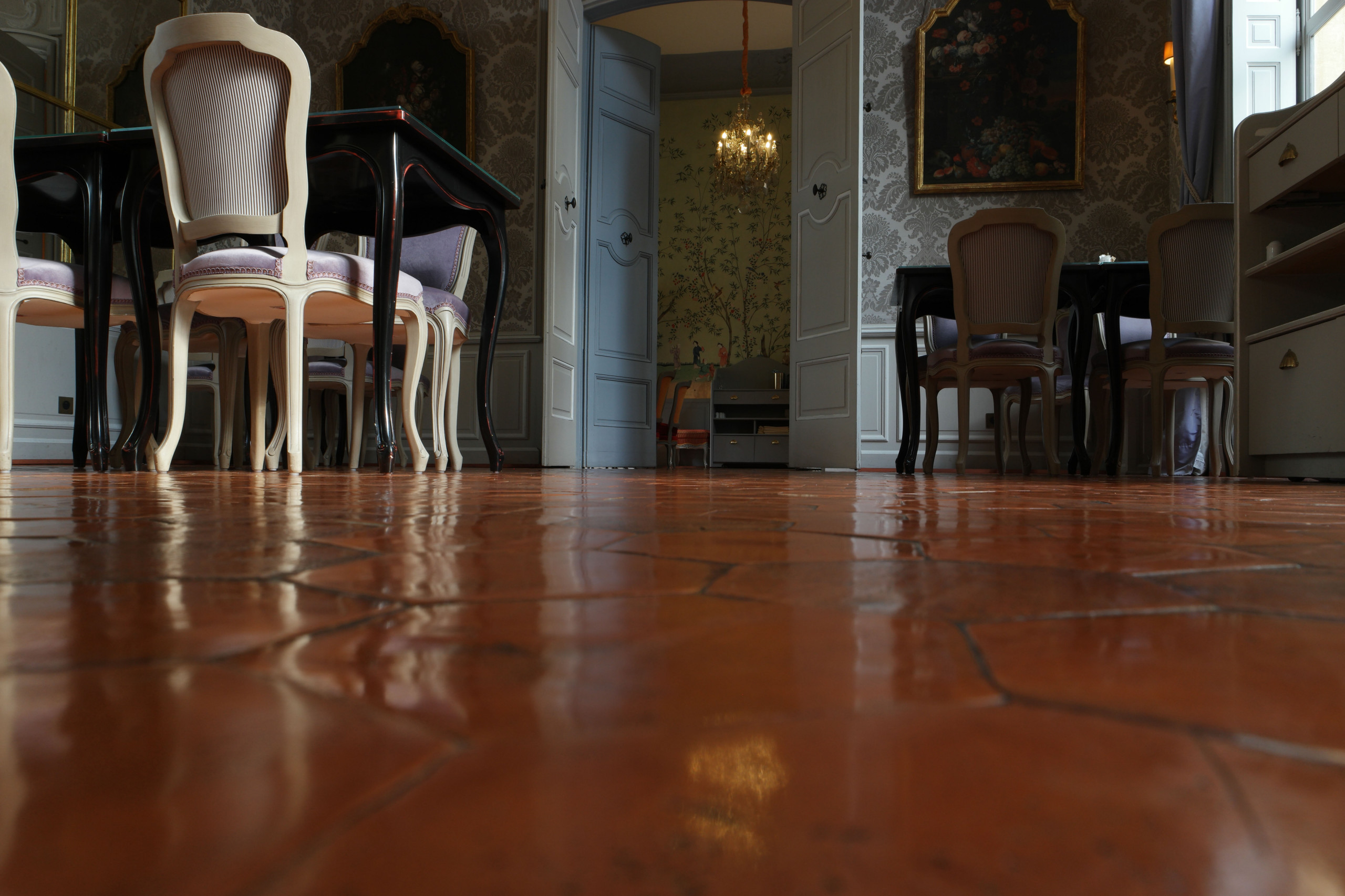 Jusqu’à il y a 50 ans, on utilisait majoritairement des tomettes de petites tailles, très rouges et très lisses, que l’on appelait des tomettes engobées. Quand elles étaient démoulées, on les plongeait dans des produits considérés aujourd’hui toxiques et interdits, avant leur séchage puis cuisson au four à bois. C’est ce qui leur donnait cet aspect. On les entretenait en appliquant un mélange d’huile de lin et d’essence de térébenthine. Cela fonçait la couleur de la tomette au fil des passages.