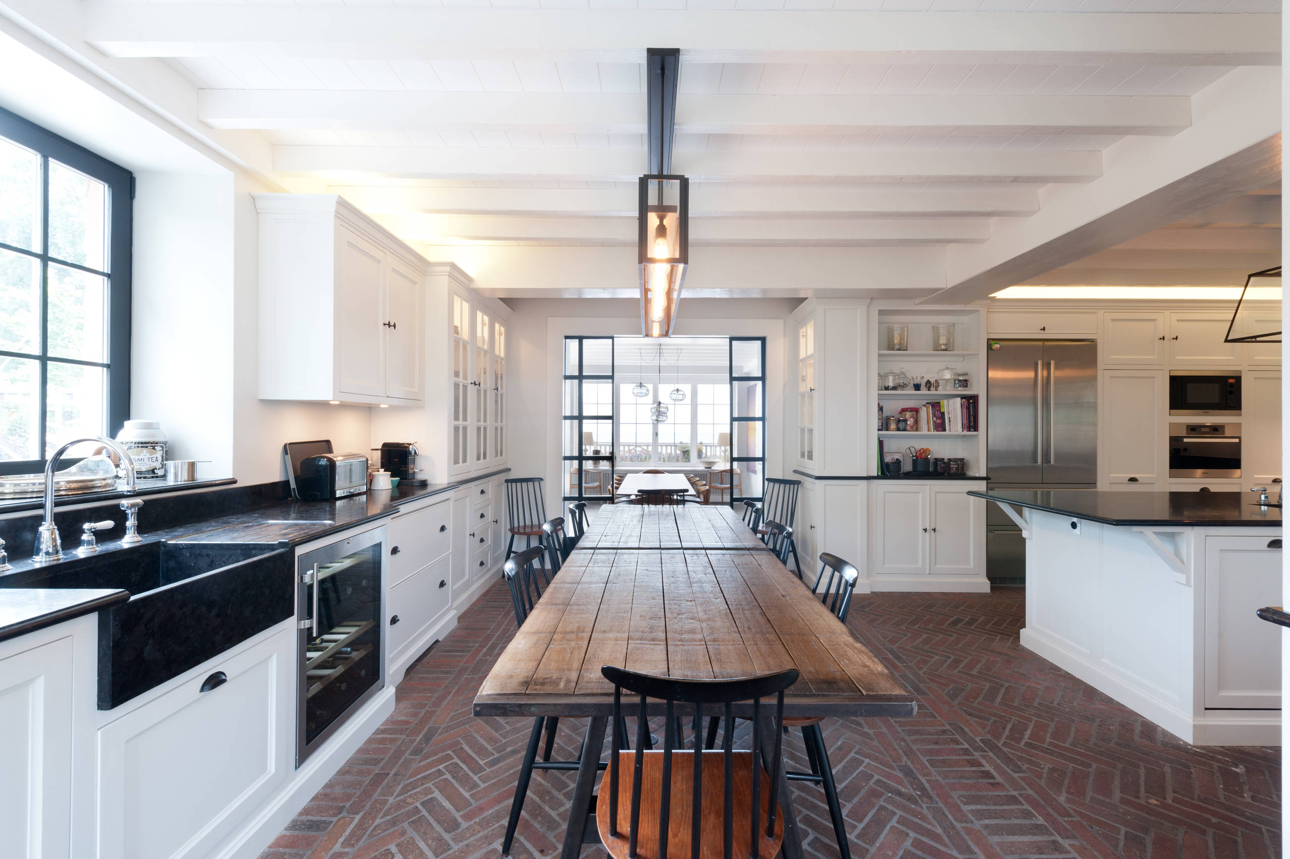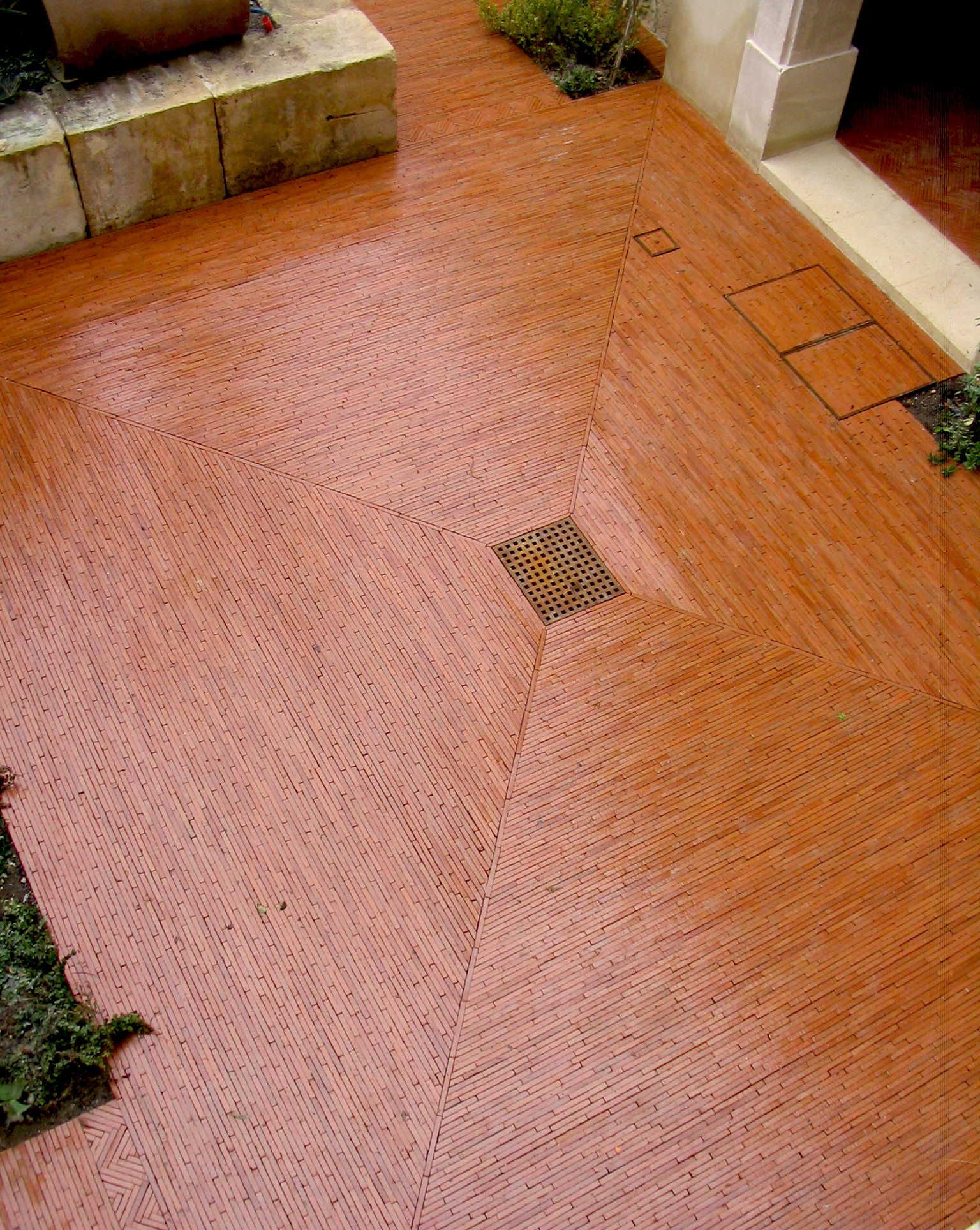 La terre cuite ne s’arrête pas aux sols en tomettes ou en carrés. On peut imaginer de jouer sur d’autres formats orignaux comme les briquettes très fines à l’instar de ce pavage en extérieur.