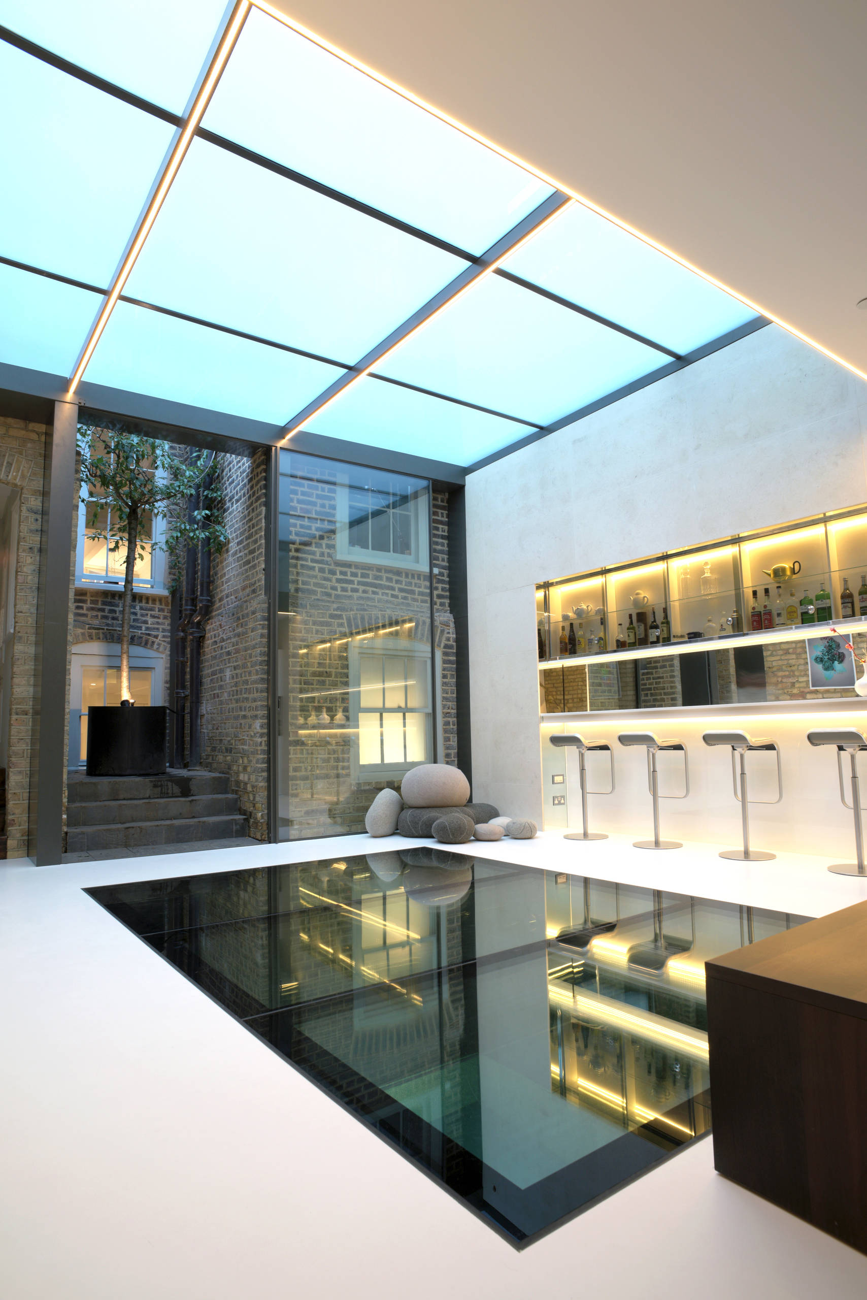 À Londres, la maison Infinity a un toit de verre et un plancher de verre. Dans un contexte urbain dense, l’équipe d’architectes de Spaced Out était obligée d’éclairer la bâtisse par le haut. À l’étage inférieur se trouve la piscine. Afin de préserver l’intimité du cœur de l’habitation exposée à des vis-à-vis, sans renoncer à voir le ciel à la demande, les architectes ont fait le choix d’un toit en verre, dit « à occultation commandée ».
