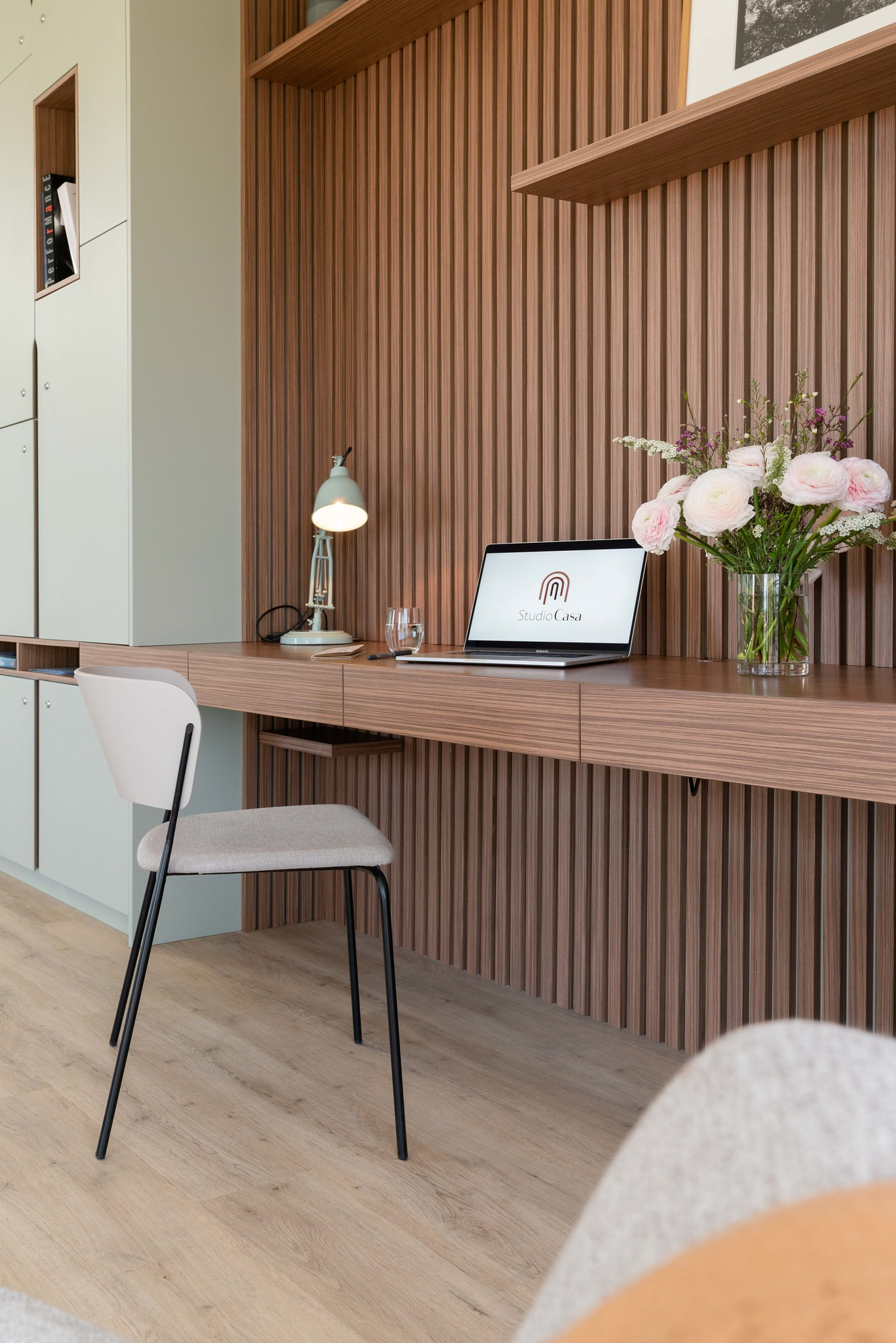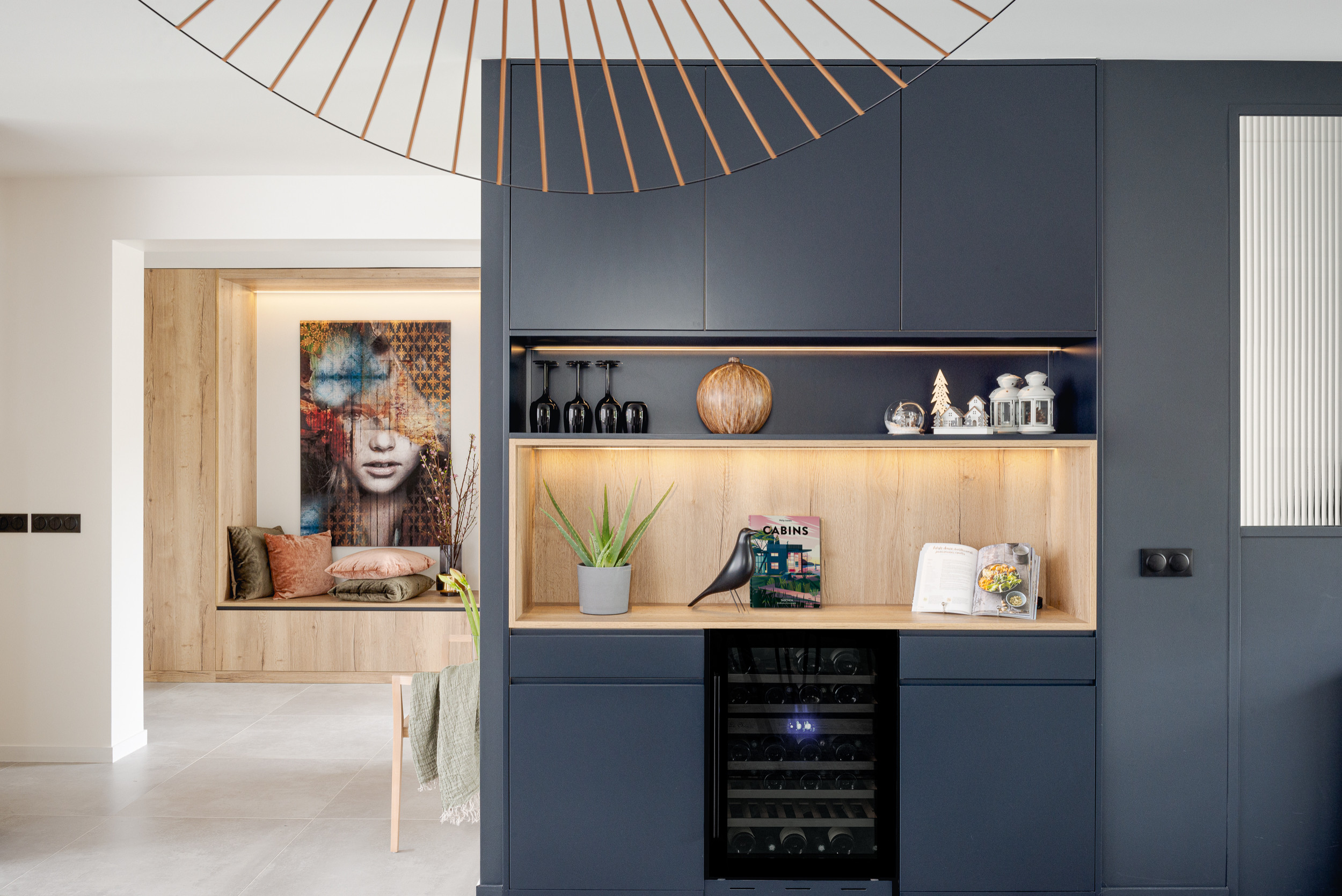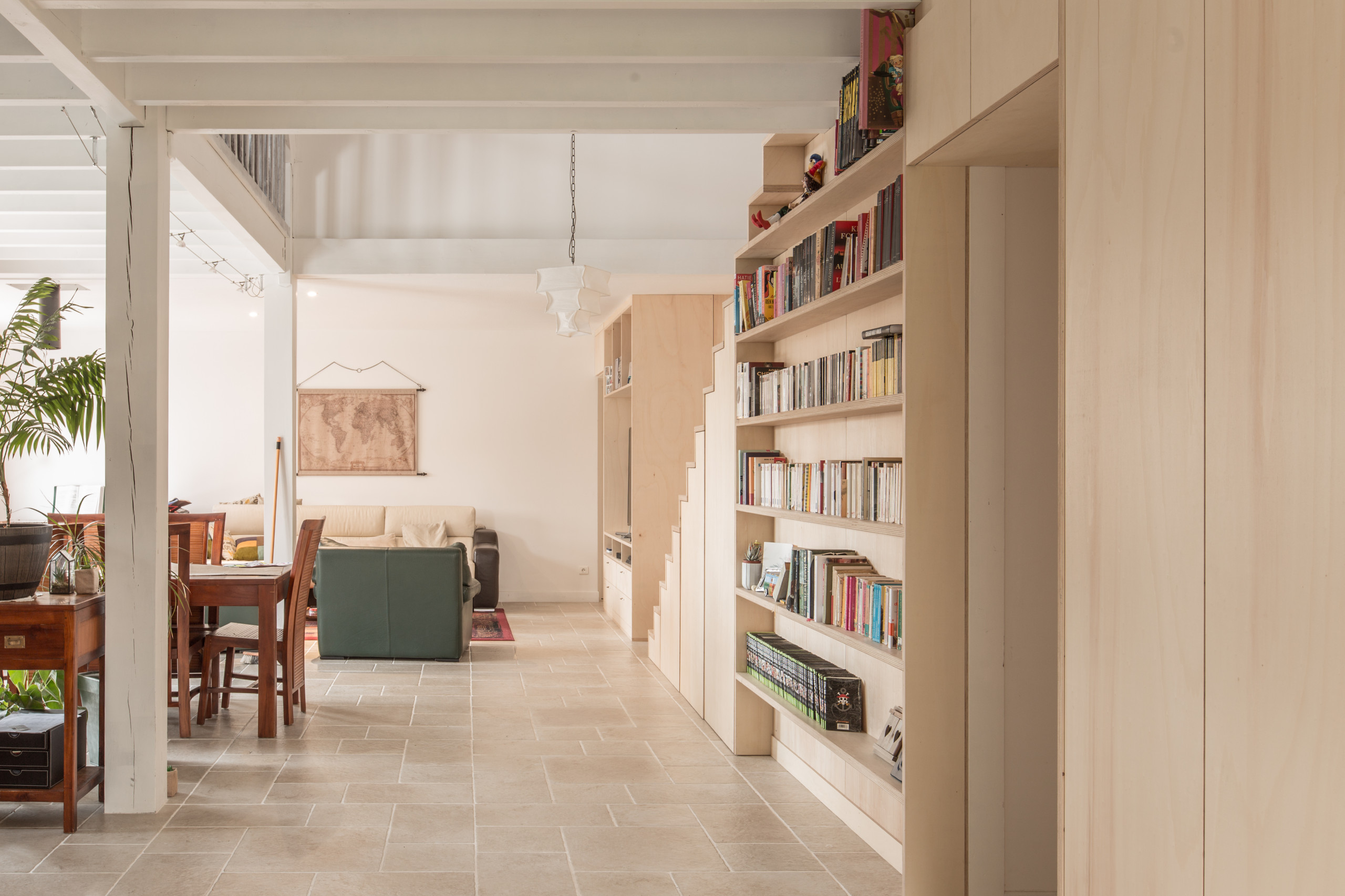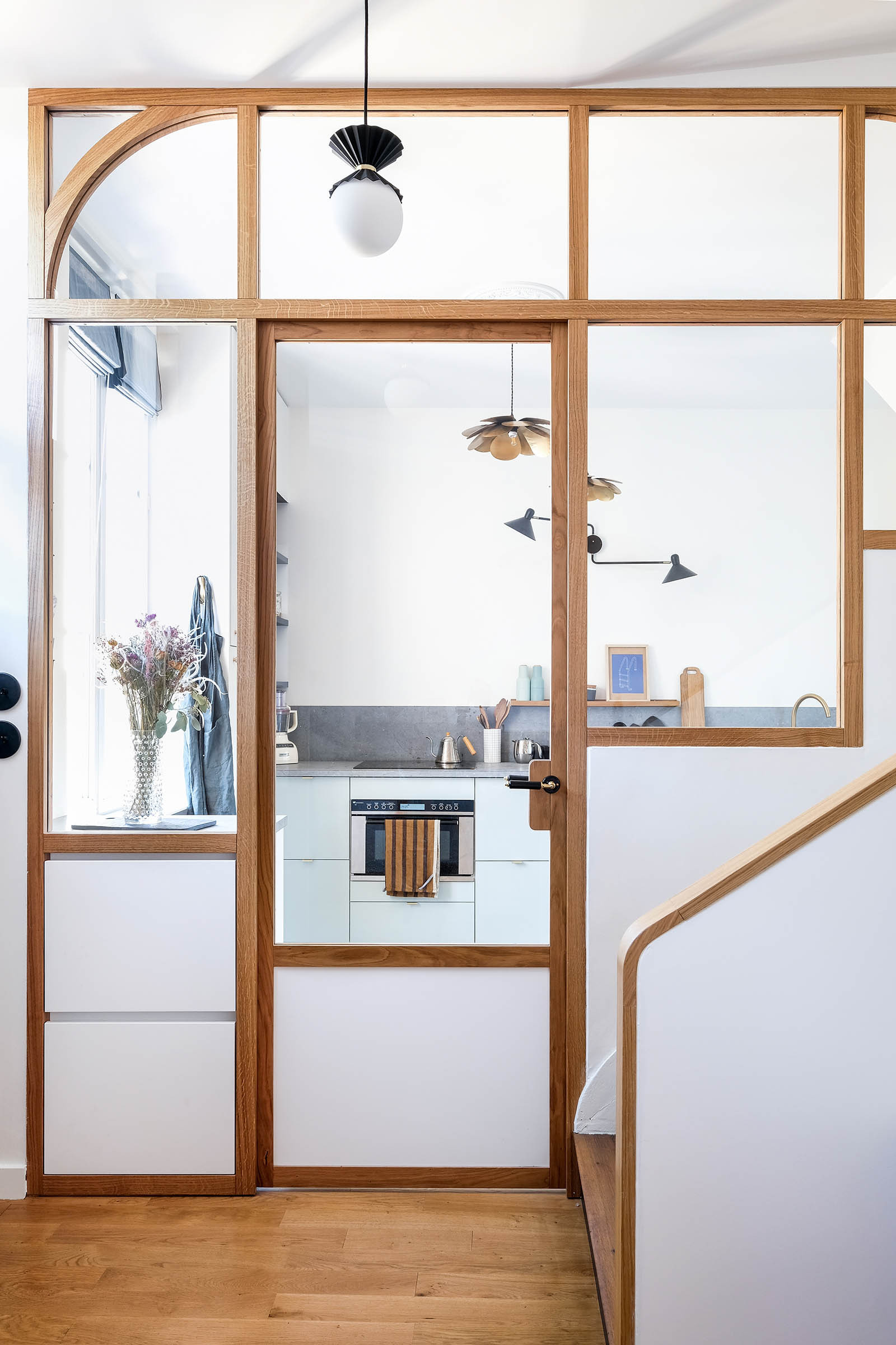 C’est en panneaux laqués mats et montants en chêne massifs qu’il a par exemple réalisé cette verrière pour séparer la pièce de vie d’une maison de Lyon 8e.