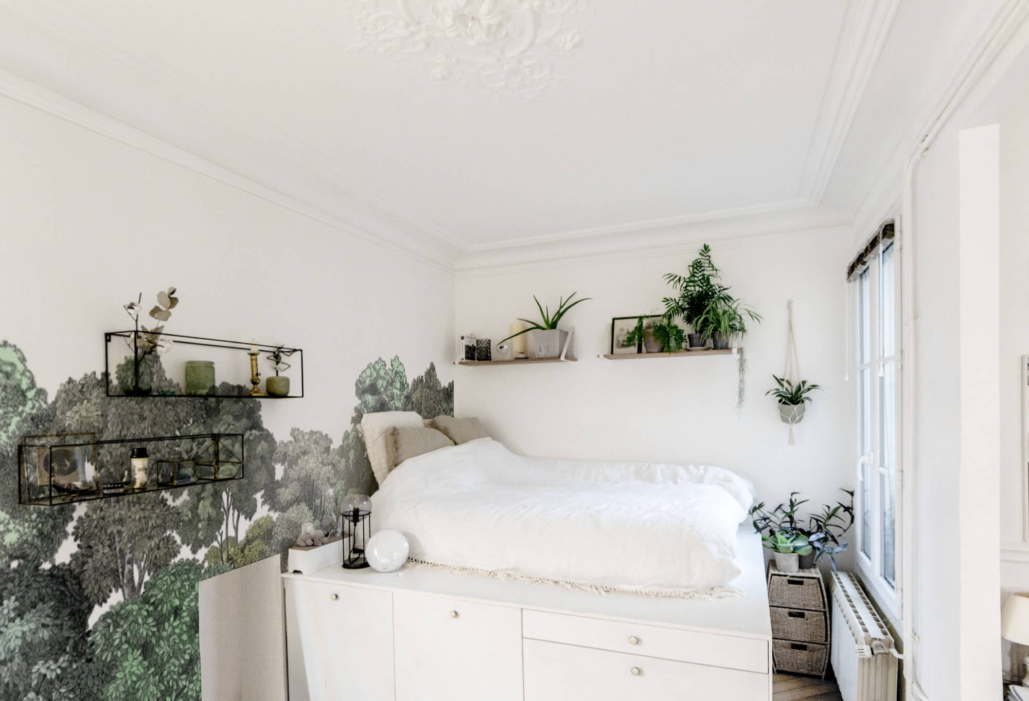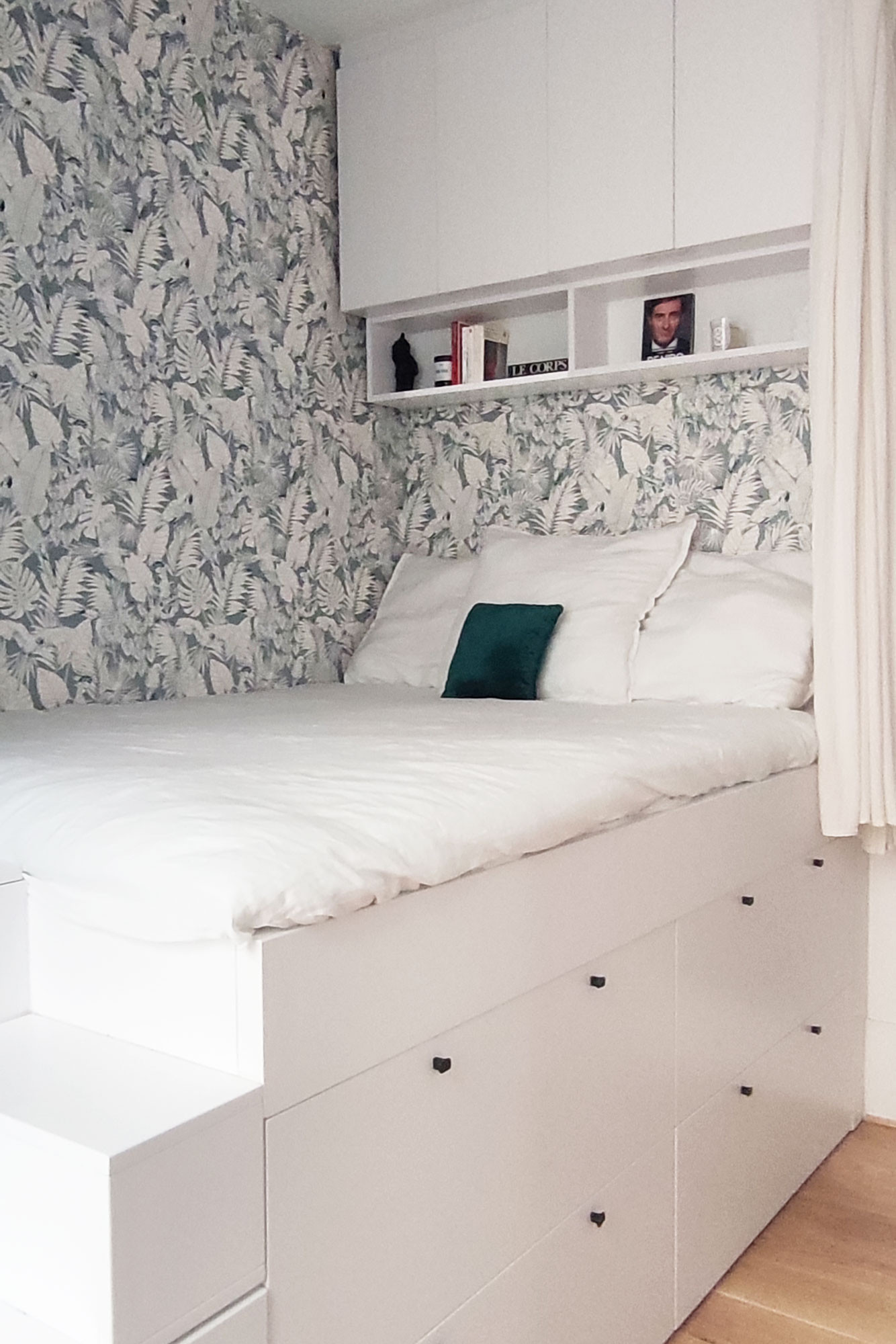 Ce lit estrade est situé dans un appartement de 35 m², dont l’aménagement a été revu par l’architecte d’intérieur Jessica Guermeur. Pour partitionner les espaces tout en les optimisant, la professionnelle a eu l’idée de créer un lit-estrade sur mesure. Mis en scène par un papier peint au motif forêt, ce dernier comprend tous les rangements nécessaires pour créer un dressing complet.