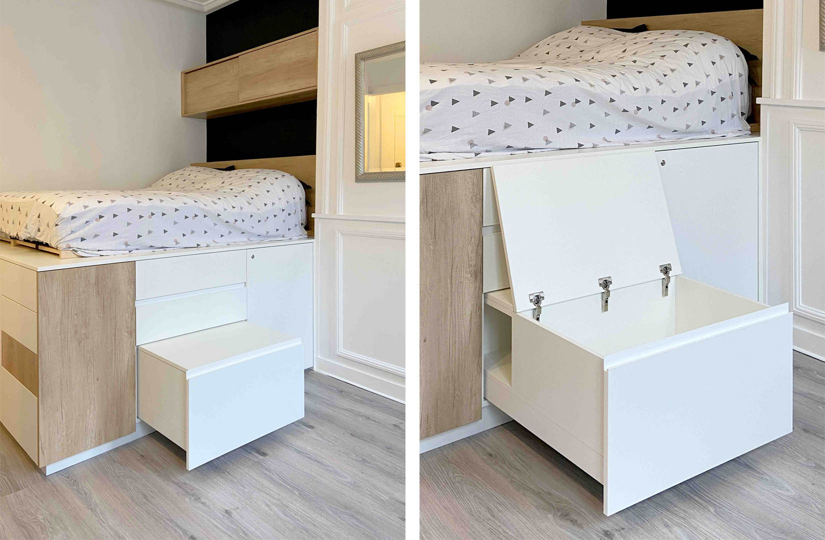 Entre le lit-tiroir et la mezzanine, surélever le lit permet de décupler les rangements selon les besoins