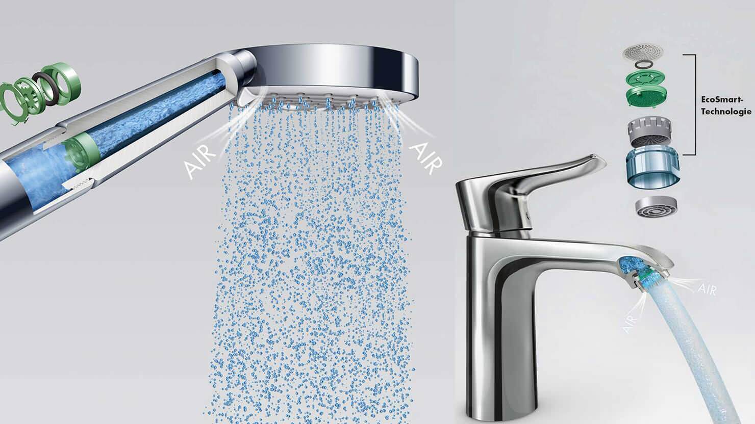 La technologie EcoSmart de Hansgrohe en est un bon exemple, puisqu’en injectant de l’air dans l’eau, elle réduit le débit des douches et des mitigeurs. Le fabricant promet une économie d’eau de 60 % dans la douche, par rapport à un débit standard.