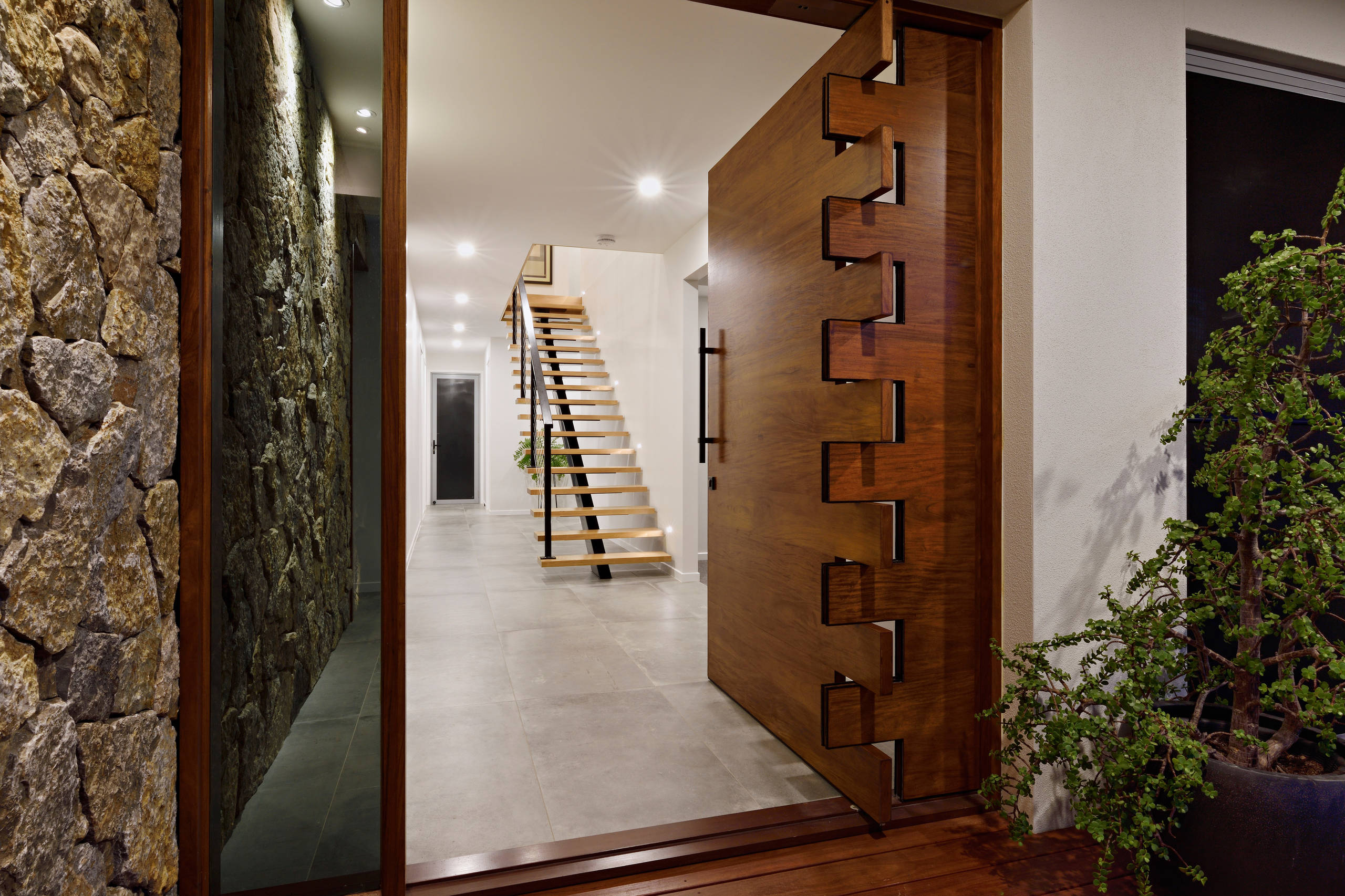 Cette grande porte d’entrée intégrée dans un panneau en bois toute hauteur s’élève en majesté dans ce vestibule très sobre par ailleurs. Elle a été fabriquée par un menuisier australien qui utilise le Wormy Chestnut, un bois de châtaignier assez rustique qui a beaucoup de personnalité. Les Opodiphthera eucalypti, larves australiennes, imprègnent le bois de traînées sinueuses lorsqu’elles se faufilent sous l’écorce pour s’alimenter. Les scolytes laissent des trous en se nourrissant du bois tendre sous écorce. Le vent chaud et les pluies diluviennes australes achèvent de lui donner des teintes changeantes qui en font un bois unique.