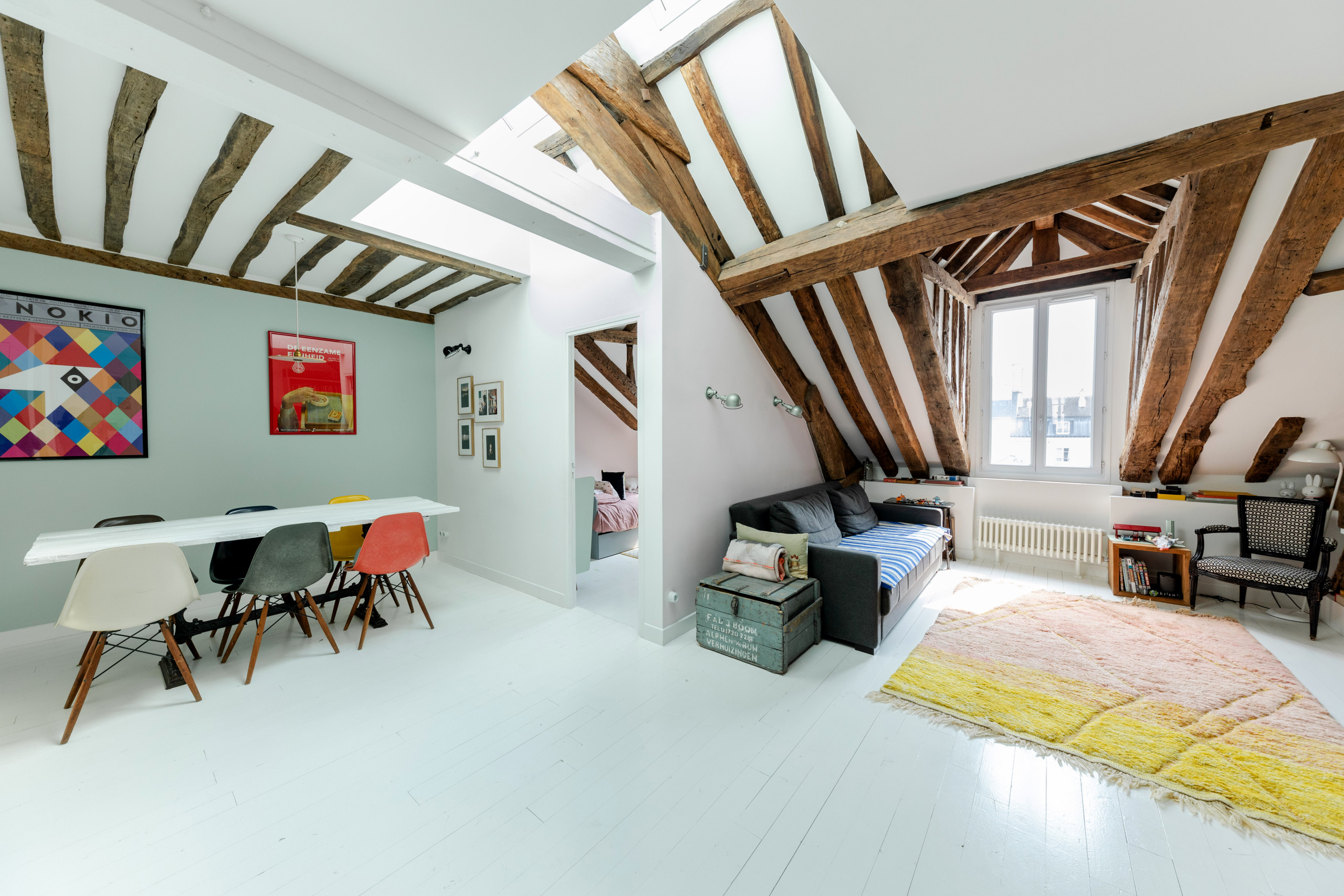 Ce sont les raisons qui ont poussé les propriétaires de ce duplex parisien, situé au dernier étage d’un immeuble du XVIIe siècle, à isoler leur toiture par l’extérieur au moyen de travaux d’envergure. « Seule la charpente d’origine a été conservée. Nous avons tout déposé pour effectuer l’isolation sur l’extérieur. Cela a permis de gagner quelques mètres carrés supplémentaires en Loi Carrez et de bénéficier d’une plus grande hauteur sous plafond, de 20 à 25 centimètres supplémentaires », raconte l’architecte d’intérieur Dimitri Vrain, qui a mené cette rénovation accompagné de la société tout corps d’état GE Renov.