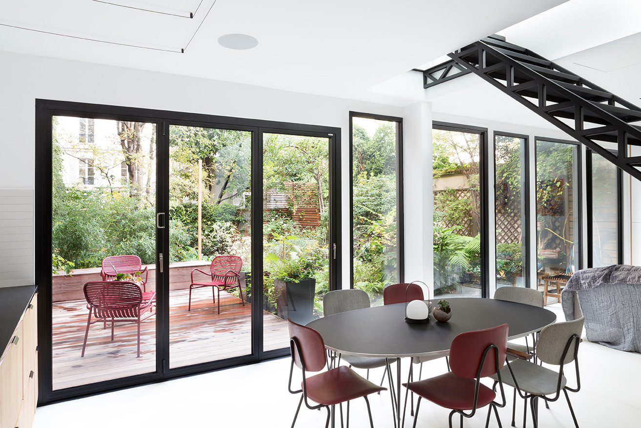 Dans cet autre projet de rénovation d’une maison en banlieue parisienne, les propriétaires, accompagnés par l’Atelier NYOOD, ont entrepris de remplacer toutes les menuiseries anciennes par des modèles double vitrage en alu thermolaqué également. La nature du vitrage est évidemment importante et plusieurs solutions sont disponibles : le double vitrage classique, le double vitrage à isolation renforcée et le triple vitrage. Notez que dans le cadre de triple vitrage, le facteur solaire est modifié et la chaleur du soleil est moins bien captée qu’avec un double vitrage.