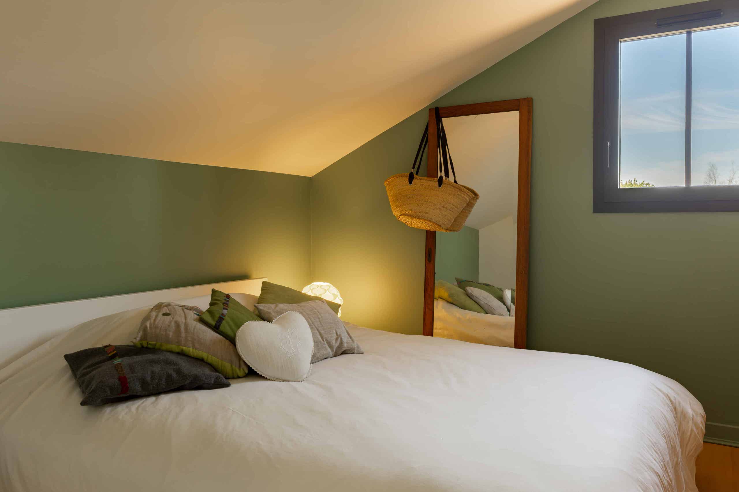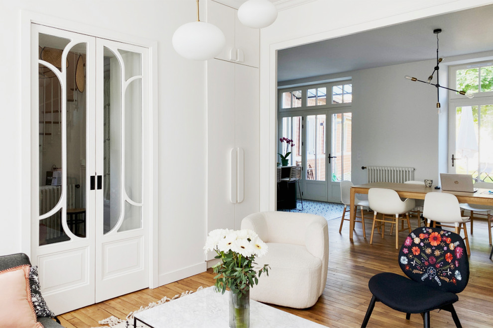 L’isolation de la toiture est primordiale pour protéger un logement du froid et des déperditions de chaleur, mais joue également un rôle essentiel en été. Les pièces sous combles sont en effet réputées, lorsqu’elles sont mal isolées, pour devenir de vrais fours lors des périodes de chaleur. C’est justement afin d’offrir un meilleur confort d’été que l’architecte d’intérieur Nathalie Manicot a proposé aux propriétaires de cette maison datant des années 1900 d’isoler les rampants avec de la fibre de bois, l’un des isolants biosourcés les plus utilisés sur le marché actuellement. « Nous avons changé toutes les menuiseries sauf la porte d’entrée et avons également isolé entre les étages en ajoutant un complexe acoustique posé sur des suspentes », complète la professionnelle.