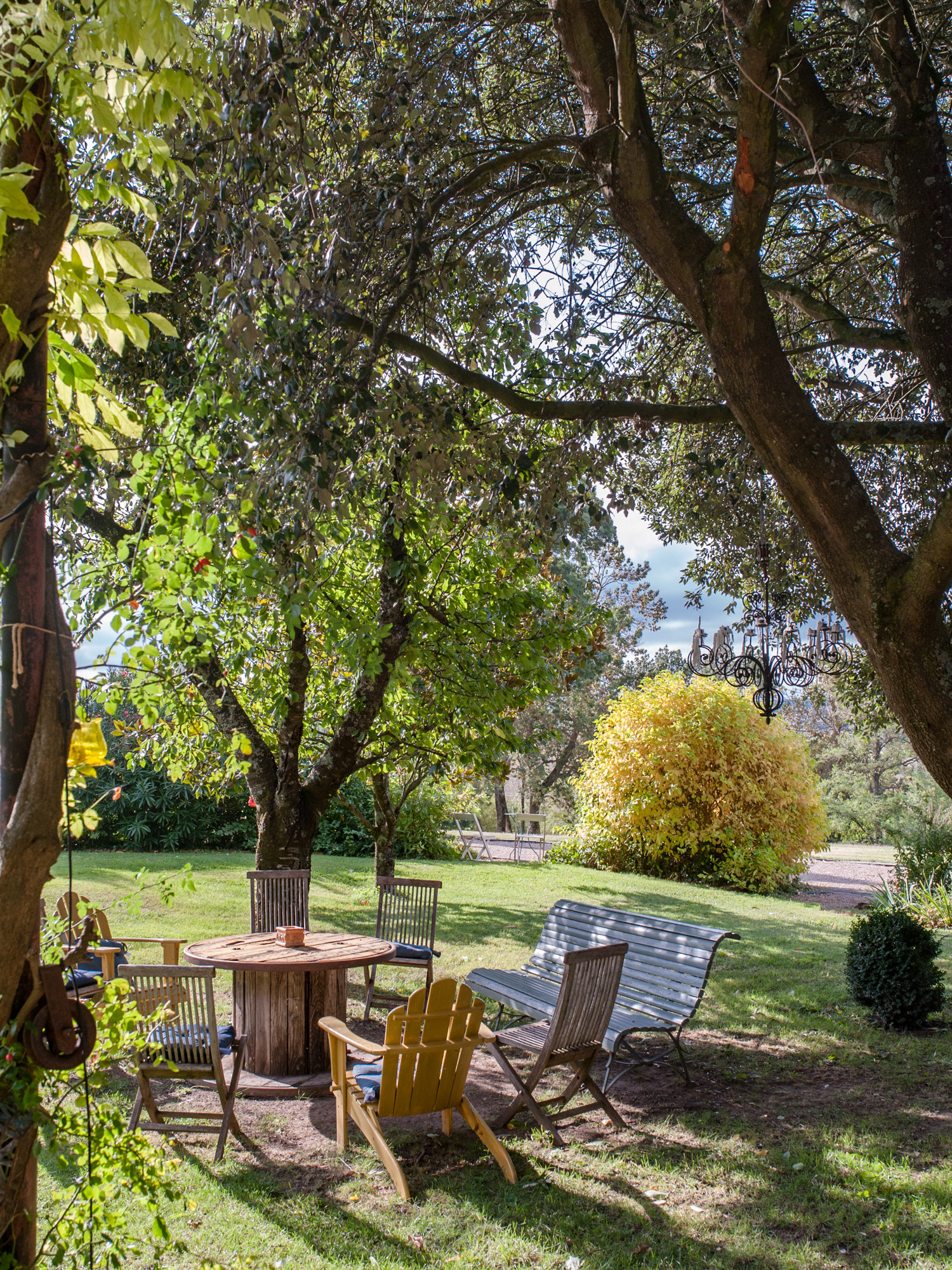 Les nouveaux parasols sont plus grands et le diamètre de leur tige est plus large qu’auparavant. Dans cette ancienne ferme, la propriétaire a détourné l’un des anciens tonneaux en pied de parasol. Un trou à la scie cloche a suffi puisqu’en châtaignier, il est assez lourd pour être stable. Sinon, penser à le remplir de sable. En guise de pas japonais, des rondins de bois en finition verni marin mènent au salon en osier tout en récup’.