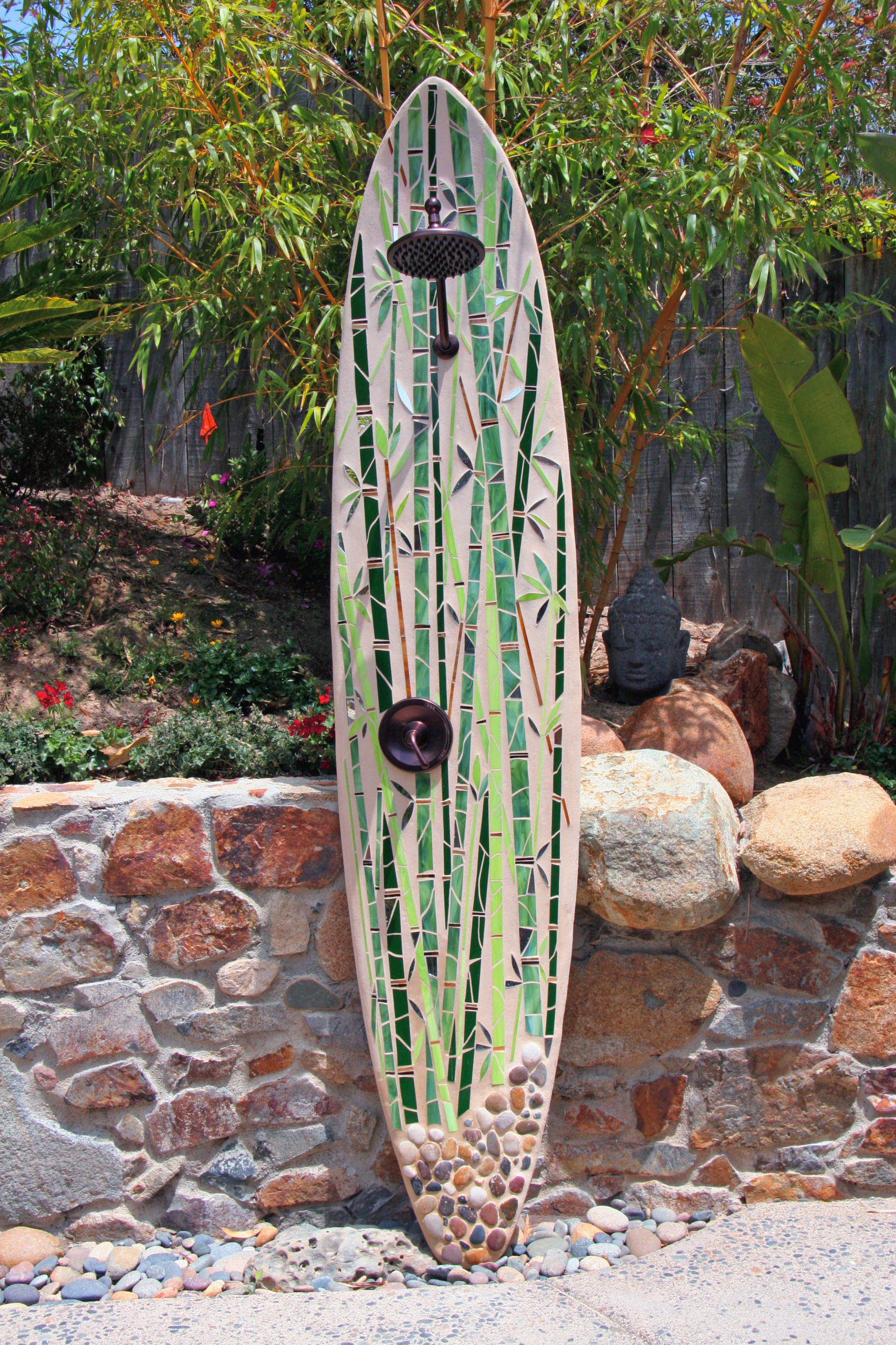 Pour les plus créatifs dans l’âme, sachez que chaque élément peut être décoré. Ainsi, ces contremarches s’embellissent de carreaux de plâtre colorés, de perles d’aquarium, comme elles pourraient l’être de coquillages. Quant à cette planche à voile, elle a non seulement été détournée en panneau de douche d’extérieur, mais elle est également décorée d’une mosaïque permettant tous les styles.