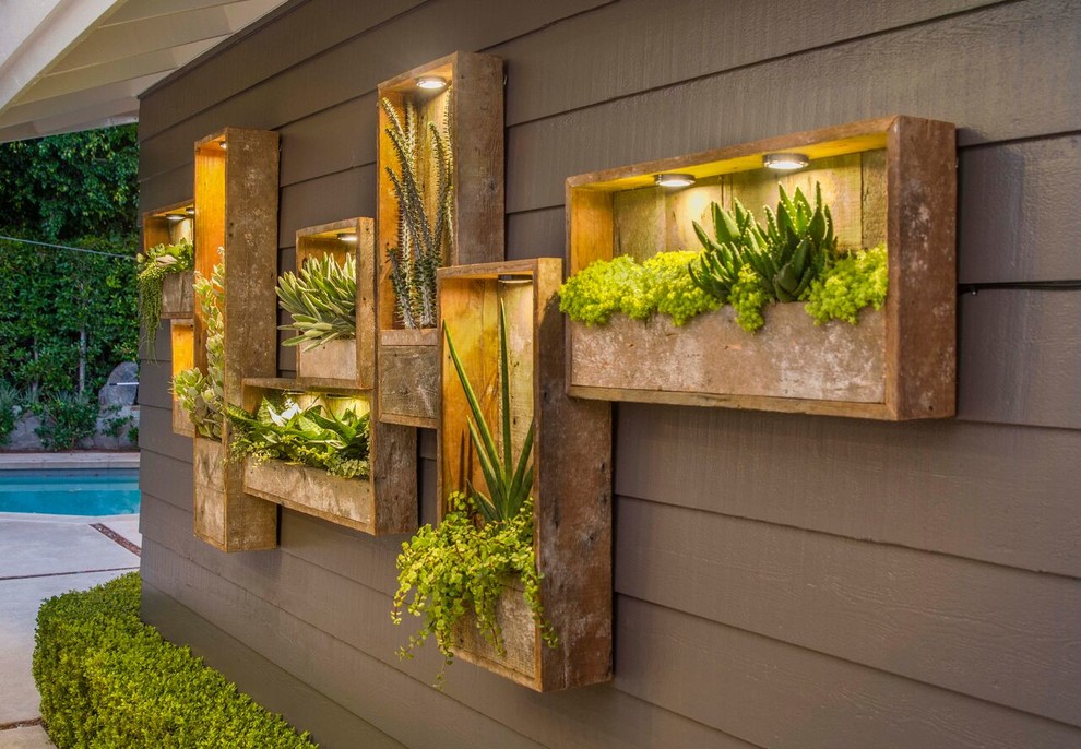 Tiroirs, caisses à vin, maxi-boîtes en bois se détournent aussi joliment comme ici en cadres végétalisés accrochés au mur. Le must : leur associer quelques lampes LED pour les éclairer le soir venu.