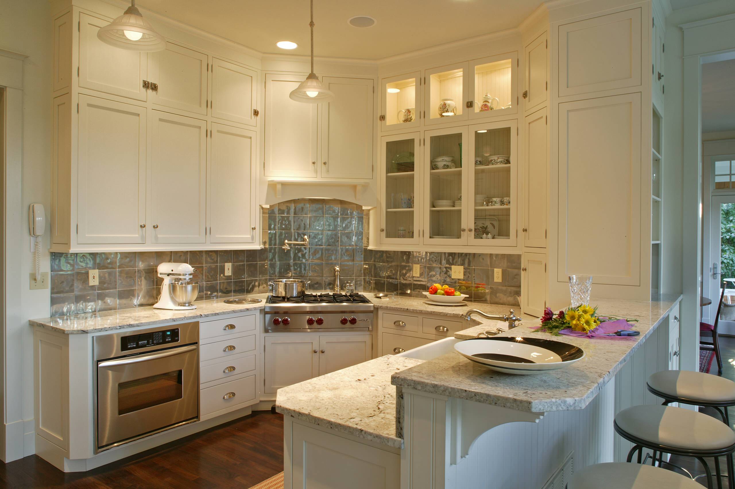 Такой вариант позволит с максимальной пользой использовать угол на кухне. А саму кухню сделает более опрятной. Ведь расставленные тут и там бытовые приборы выглядят несколько хаотично.