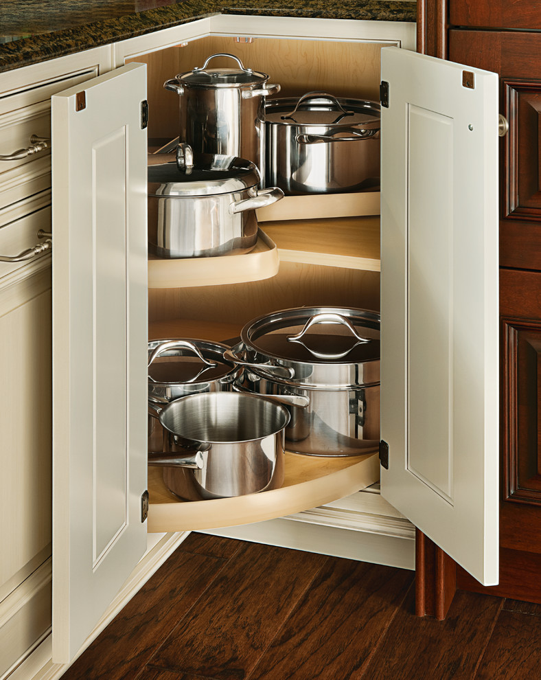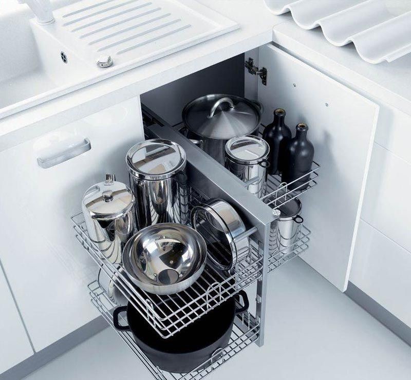 Первый и очевидный совет — установить в угловой шкаф на кухне «карусель» (так называют внутреннюю конструкцию с вращающимися полками). Доставать предметы будет не в пример удобнее! Правда, углы шкафа все останутся не задействованными, ведь форма у «карусели» круглая, а форма шкафа — трапеция.